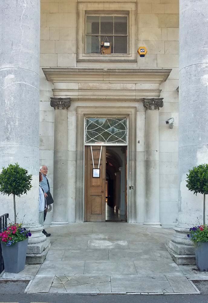 The imposing, and out of scale, portico added many years after the original building was constructed.
