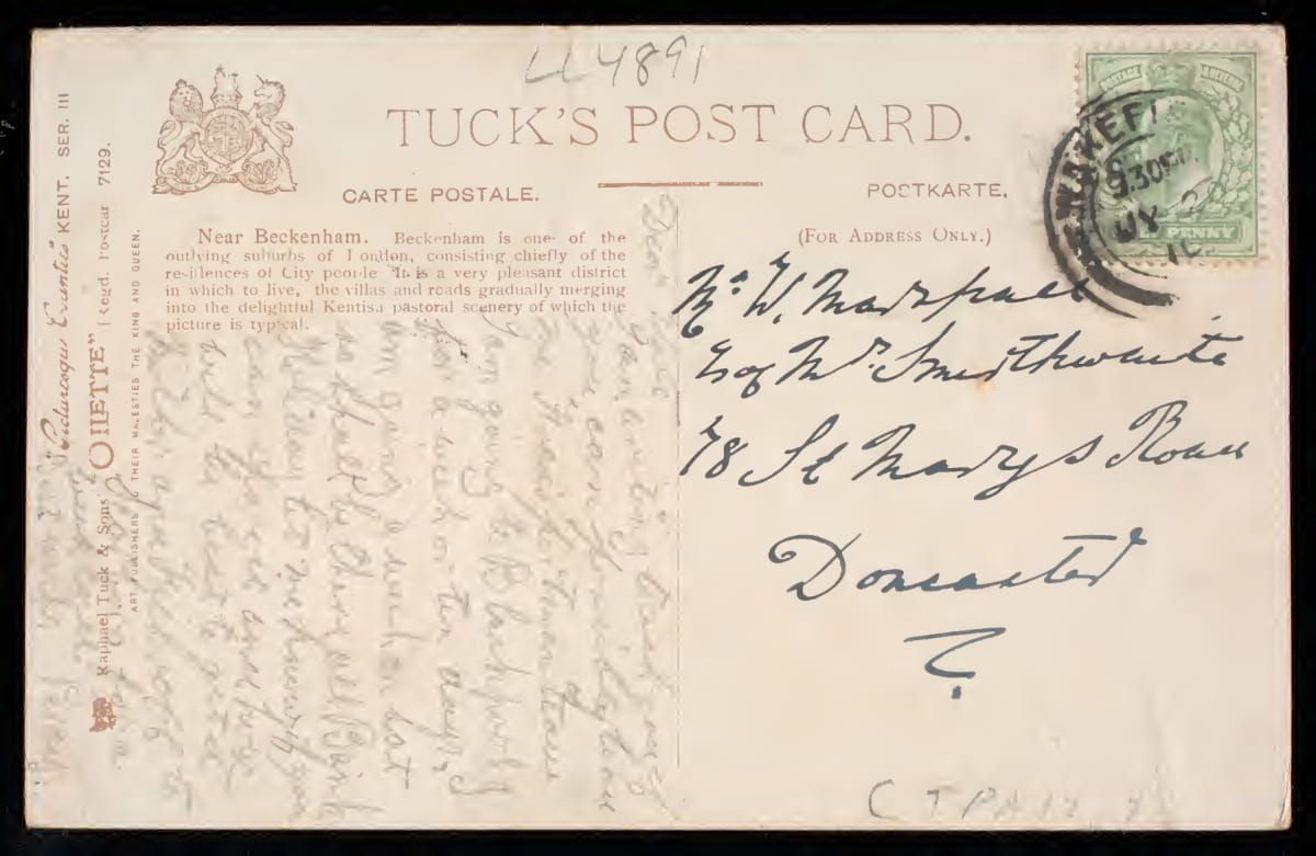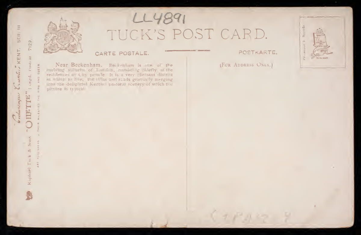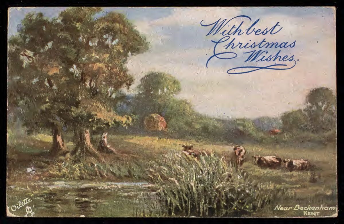 A single post card in both its unused and used conditions, with two different Christmas greetings endorsements. Those on which the date can be read were posted in 1906. Nothing is known of the writers and recipients but it is an interesting example of the way postcards were sold and used. The location "Near Beckenham Kent" is hard to locate today, but if you have any ideas, please let us know!