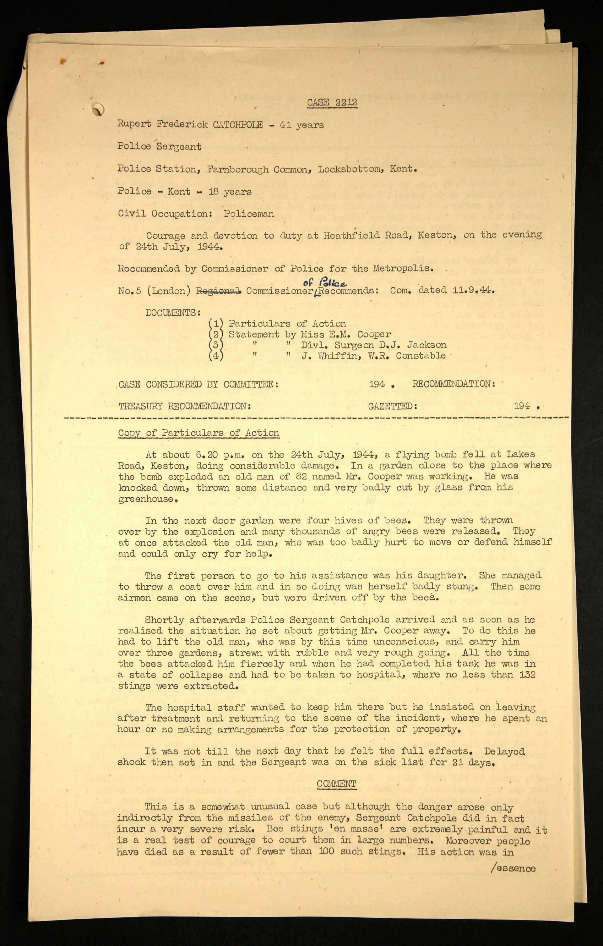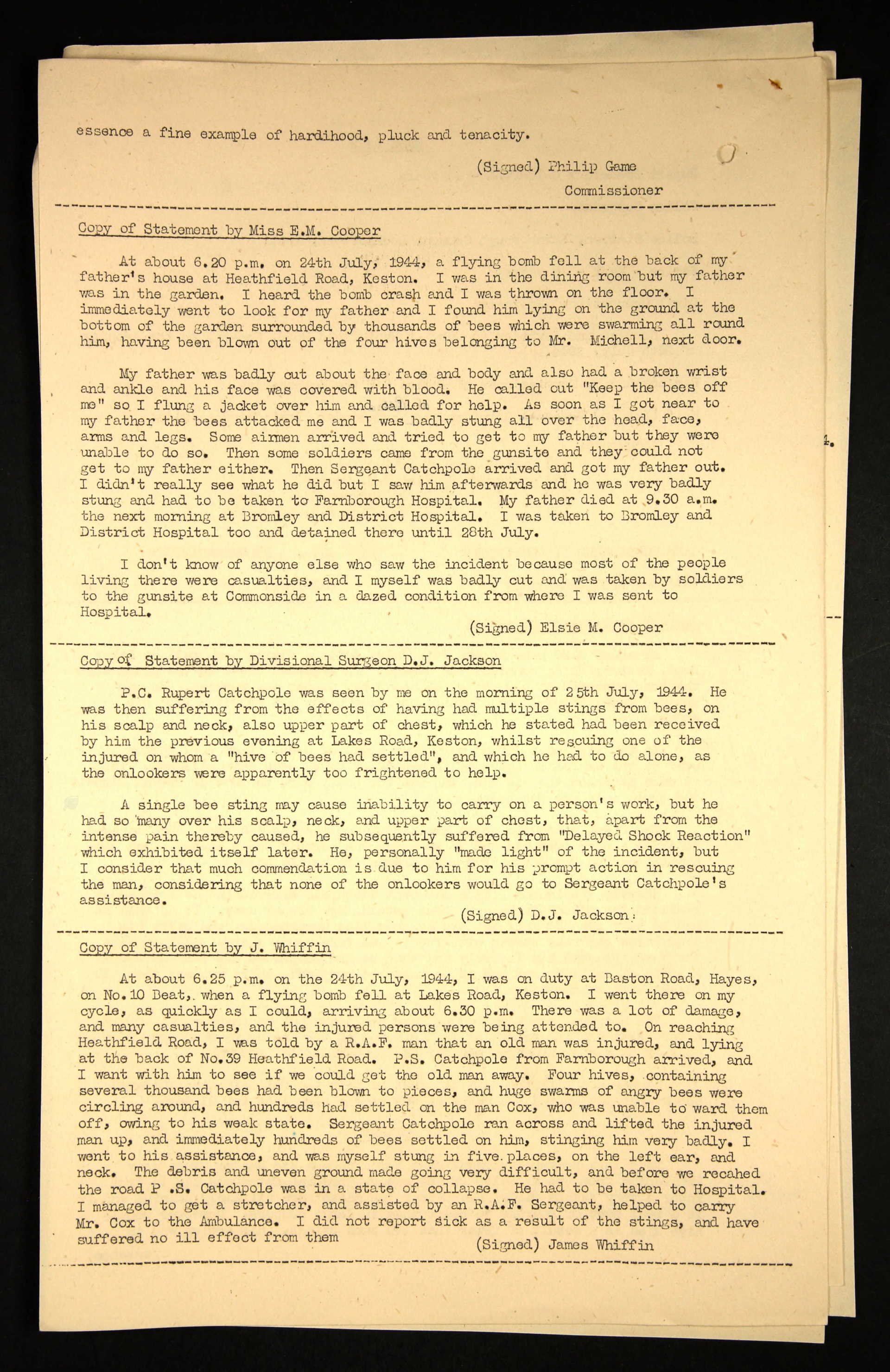P.C. Rupert Catchpole was seen by me on the morning of 2 5th July, 1944. He was then suffering from the effects of having had rru1tip1e stings from bees, on his scalp and neck, also upper part of chest, which he stated had been received by him the previous evening at Lakes Road, Keston, whilst rescuing one of the injured on whom a "hive of bees had settled", and which he had to do alone, as the onlookers were apparently too frightened to help.