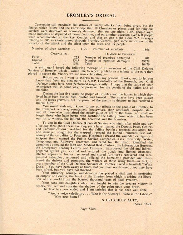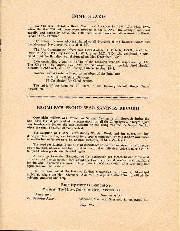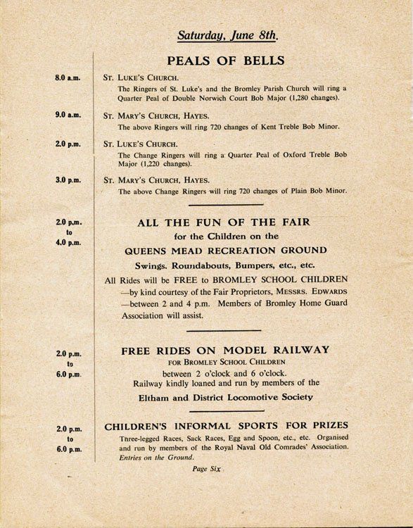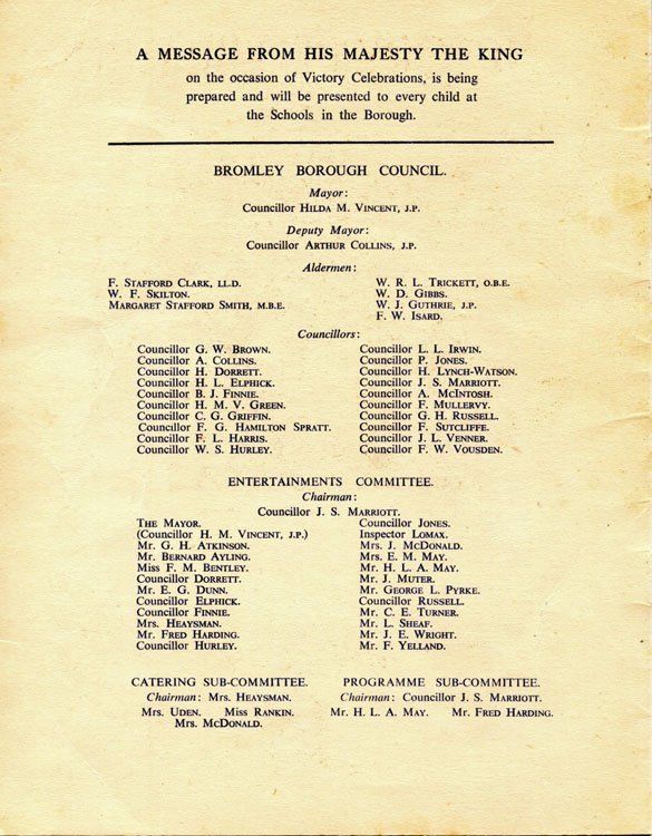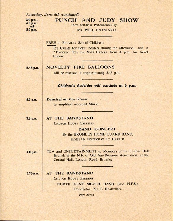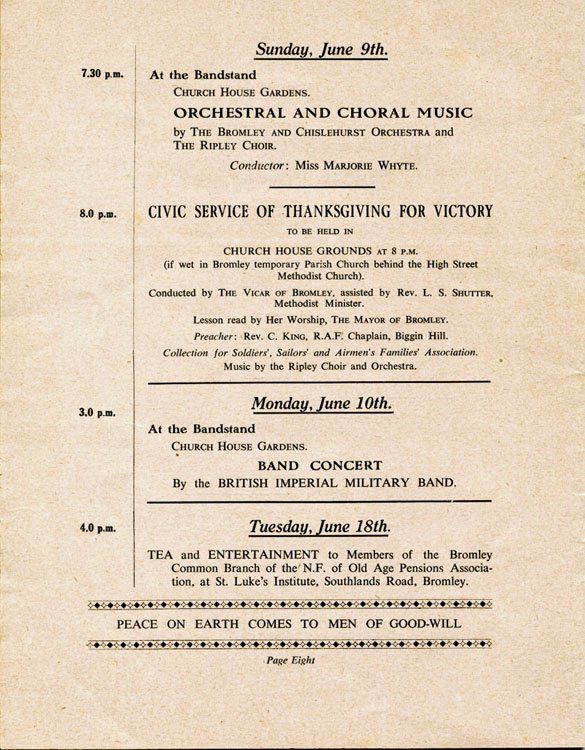 In common with many other towns, Bromley had its own parades, entertainments and church services. The programme of these events was in a twelve page booklet, reproduced below, a copy of which has been kindly sent to us by Gillian Risso-Gill who found it among the effects of the late Dorothy Drouin nee Chesney. She lived at Robert Whyte House in Bickley until her death in2004 at the age of 101 having previously run a hairdressing salon in London Road during the 1920/30s.