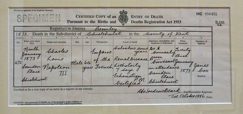 A copy of the Emperor's death certificate - his demise following an unsuccessful attempt to remove his kidney stones.