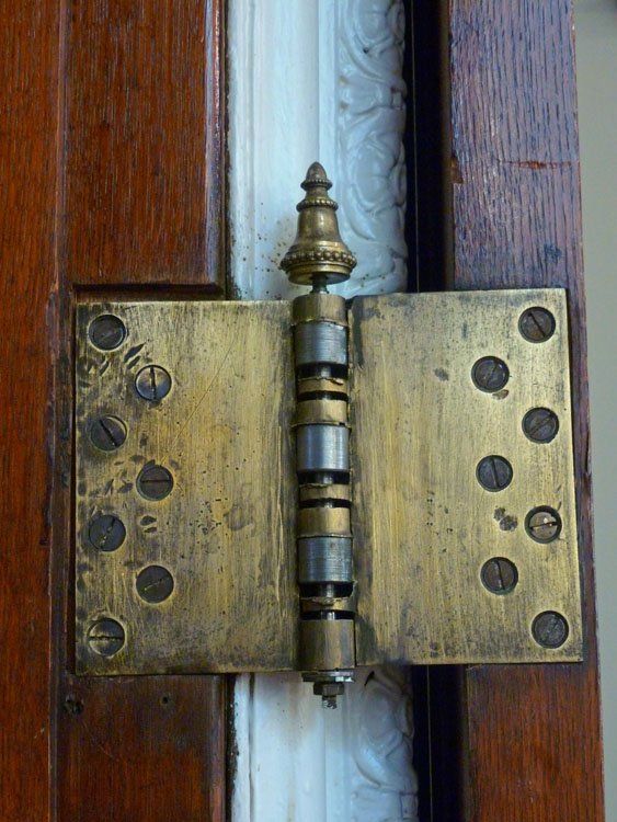 A door hinge which helps give a feel for the size of the doors into what was the dining room.