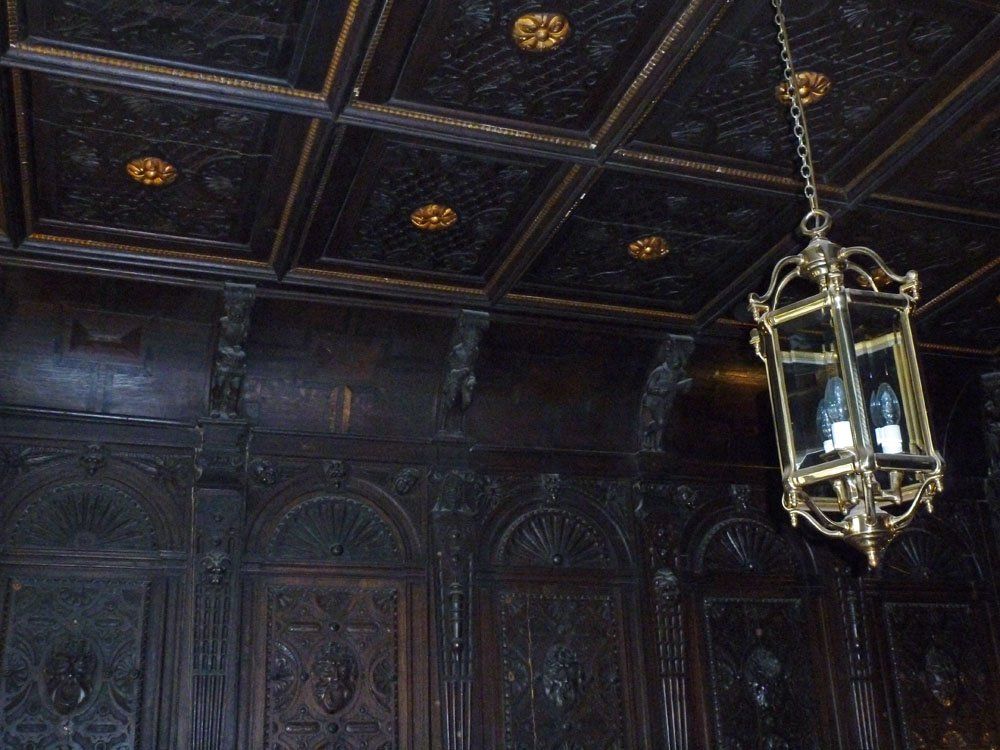 The dark wood of the carved Jacobean entrance hall makes a stark contrast with the rest of the builiding. It also contains two concealed doors in the walls on either side.