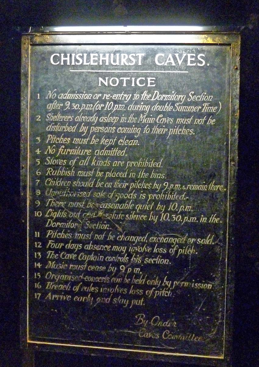 Inside can be found the Rules board with many references to "pitches" which were the individually allocated small section of the cave for families. With up to 15,000 people sheltering at one time, a considerable measure of discipline and control was essential.