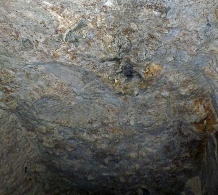 Confirming the aquatic origin of the chalk, one cave shows the outline of an ammonite, about three feet across.