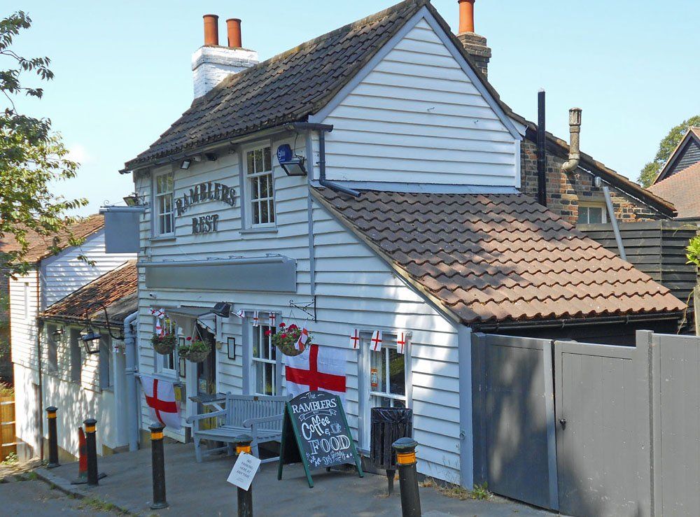 The nearby Ramblers Rest inn, an C18th century Kentish clapboard design seen here in its English World Cup football guise. The pub was orginally called the Millers Arms, reflecting the location of the Chislehurst windmill a 100 yards or so to the south east.