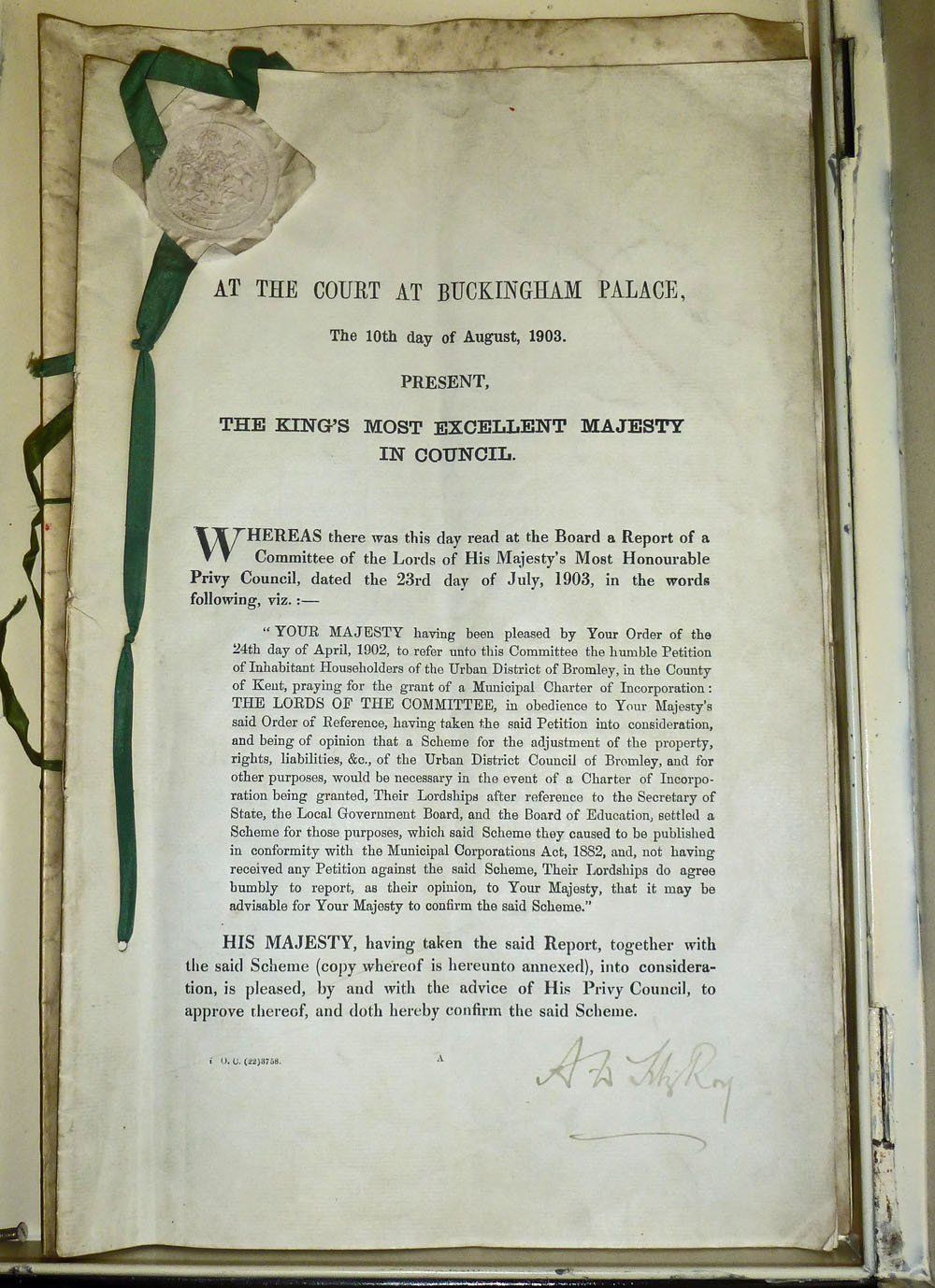 The Privy Council's approval of Bromley's request to become a Borough, 10/08/1903.