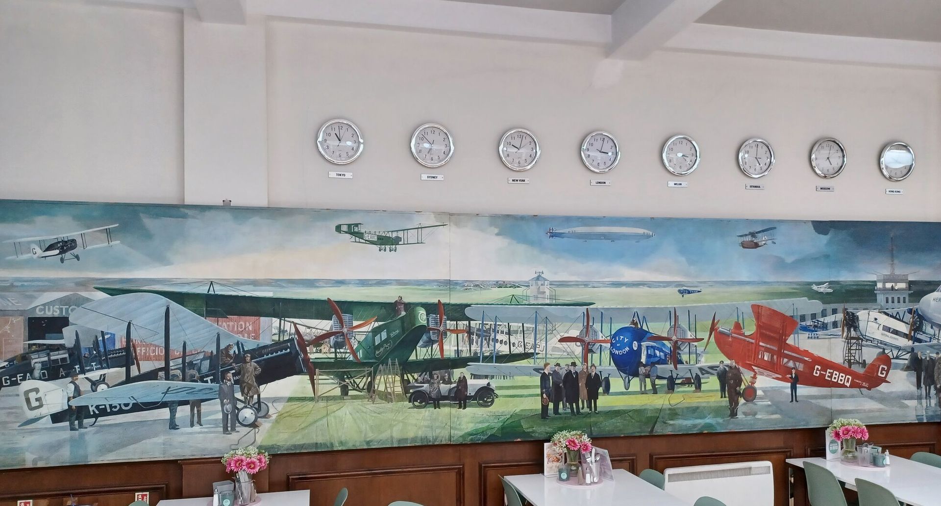 Part of a mural created in 1953 to mark the opening of Heathrow Airport (and effectively the end of Croydon). It shows the development of passenger aircraft and their crew over time. The other half of this mural is at Heathrow.