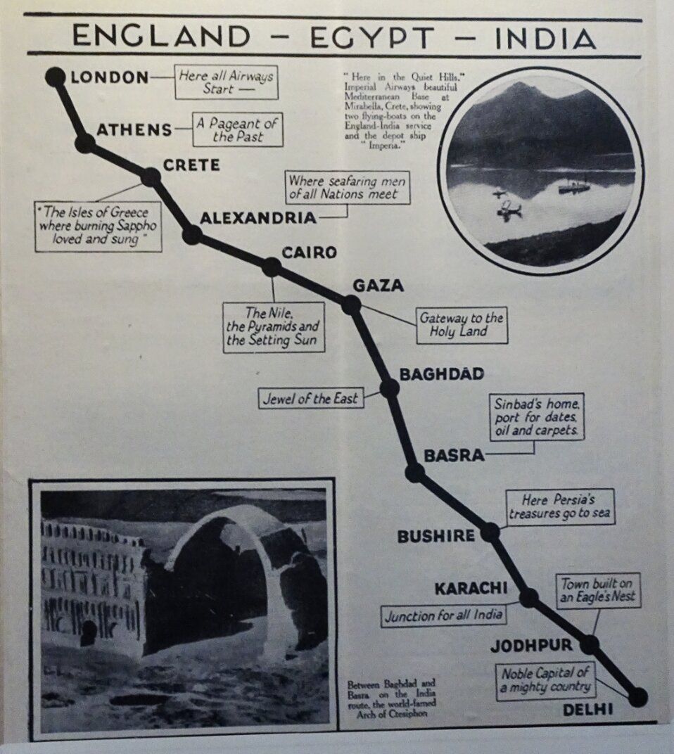 The Imperial Airways route map to India. It includes mention of flying boats which were often a preferred alternative as they were larger and more comfortable. However, they would have left from Southampton.