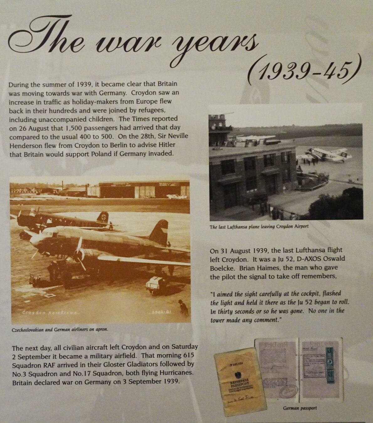 In 1939, with the outbreak of war, all civilian traffic ceased and Croydon became an RAF station. It was returned to civillian use in 1946 but never recovered its former position as the London airport.