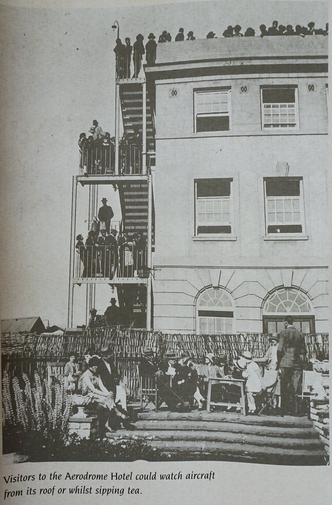 Just to the north of the passenger terminal was the Aerodrome Hotel. It remains to this day, although the somewhat precarious iron stair has been removed and the top gallery replaced with a new storey.