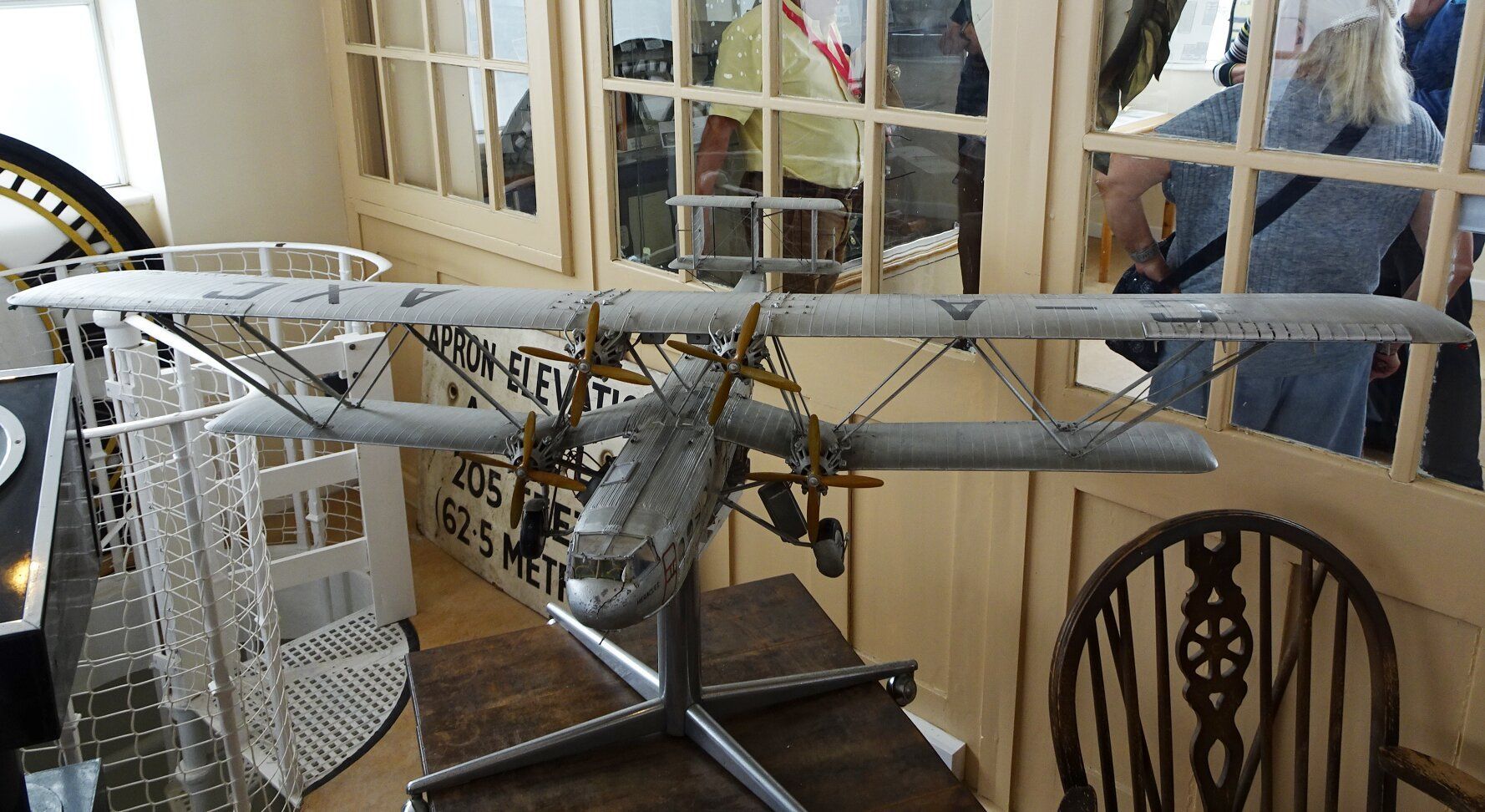 A model of an Imperial Airways Handley Page 42 plane now in the Control tower. Although an important componant of the fleet, they were not reliable and all had been withdrawn by 1940. On the left can be seen a spiral staircase, the original access route to the top of the building.