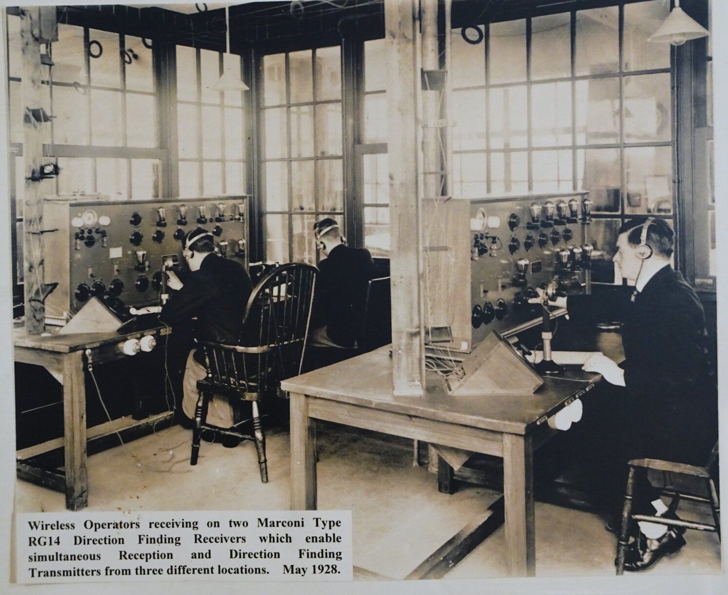 Traffic control in 1928. A picture taken in the then new Control Tower showing early electronic equipment for tracking the movement of planes. The tower and direction finding aerials at each corner can be seen in the second photo above.