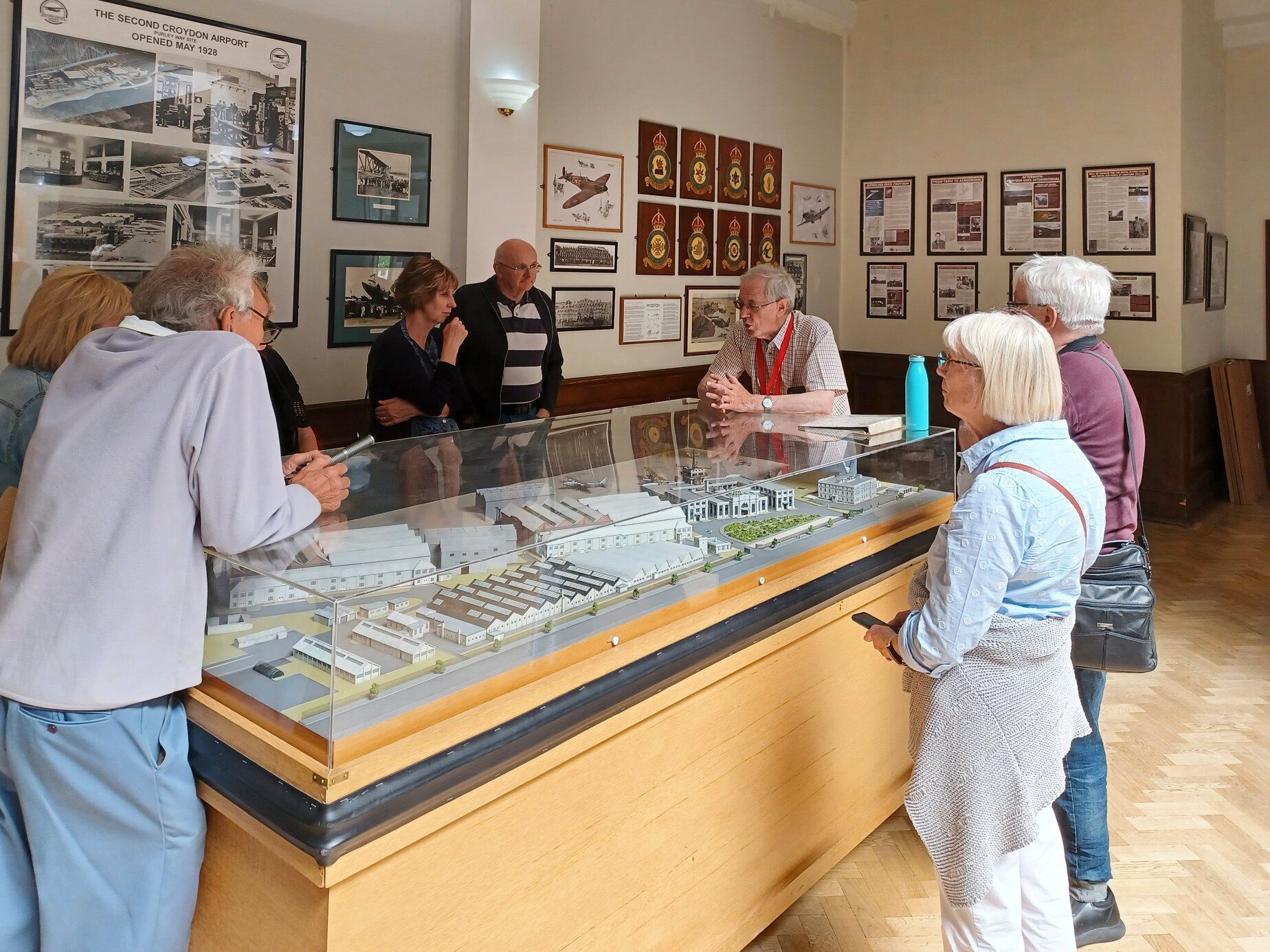 Some members of BBLHS gather round a scale model of the civil airport at its greatest extent in the 1930s to hear more from the guide.