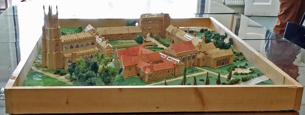 A model made in the School showing the original extent of the old Palace with extant buildings having red roofs.