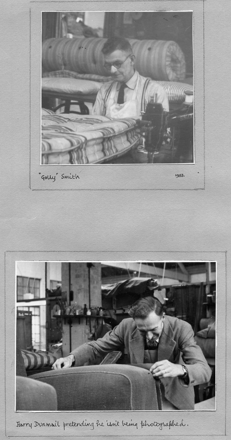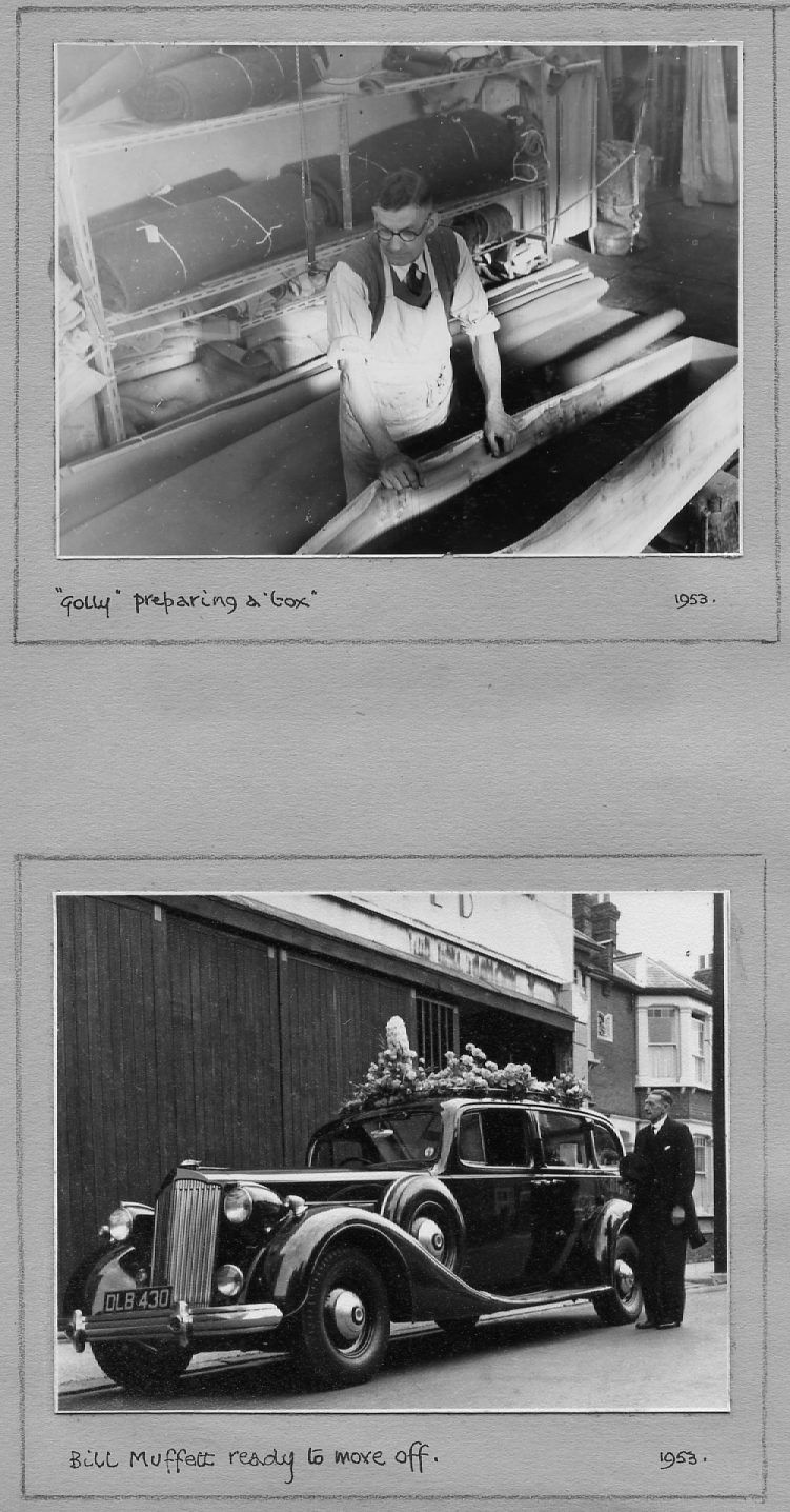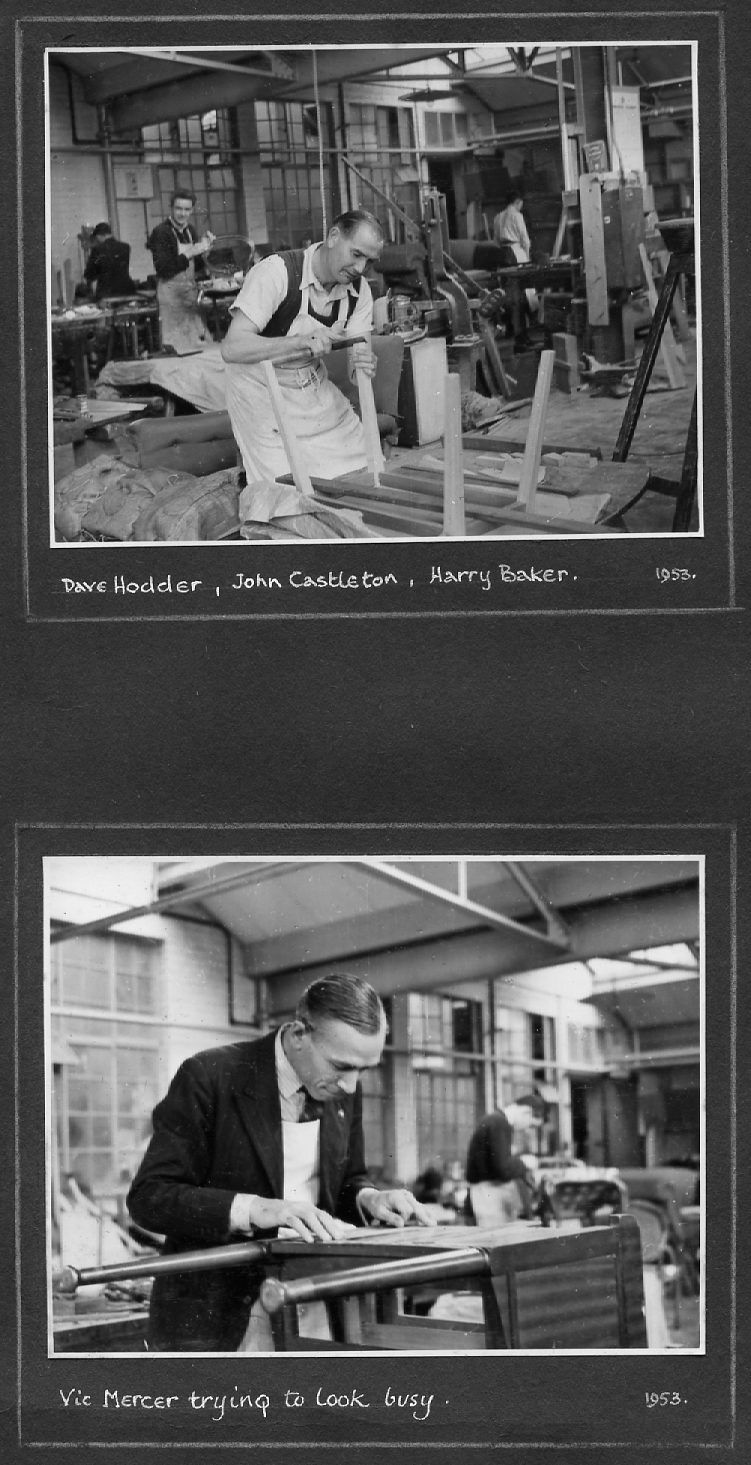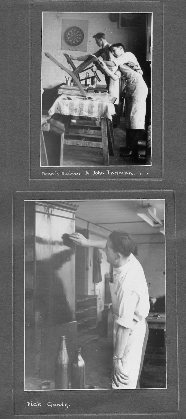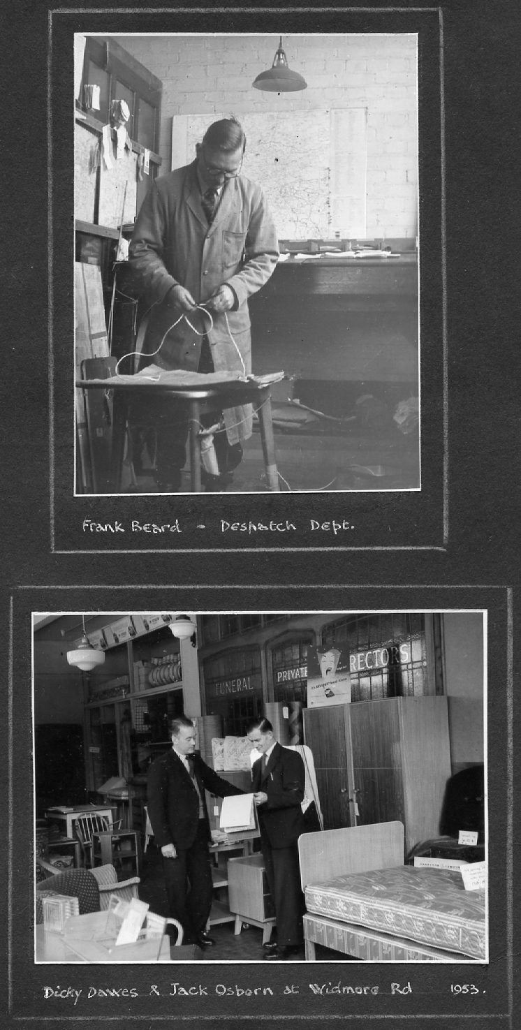 The pictures below are as they appear in the album, pasted on a variety of coloured paper. They are not entirely in date order but many are captioned and dated. They include pre- and post-war photos covering the many activities of the Company including furniture making and sales, coffins and warehousing. A number of photos are of the staff around 1950 and if they or their descendants can provide any more information, this would be gratefully received.