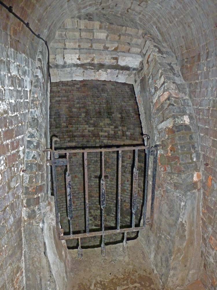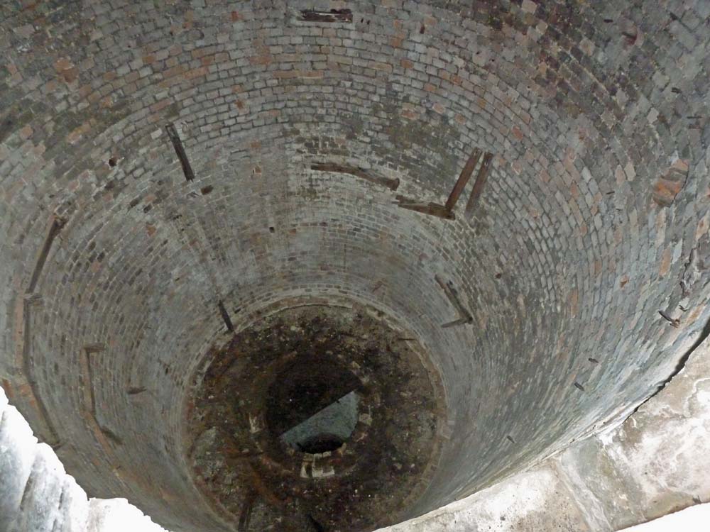 The roof of the ice well through which the blocks of ice, probably imported from Scandinavia, were dropped. It also gives another view of the complex and very thick brickwork. The camera has given a slightly strange impression of the dome and access hatch which can be seen from outside.