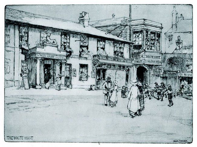 The White Hart was for many years the hub of activity in Bromley having large premises, stabling, a cricket ground behind and was the location of choice for inquests! The space in front of it in later years became a car park until it was demolished around 1960 to make way for some more shops. The large stag which can be seen above the main door unfortunately disappeared at the same time. On the right were the stables and garage where you could hire cars from James Young and Co. On the extreme right are the premises of Mr. Albion Russell and Sons, bootmakers.