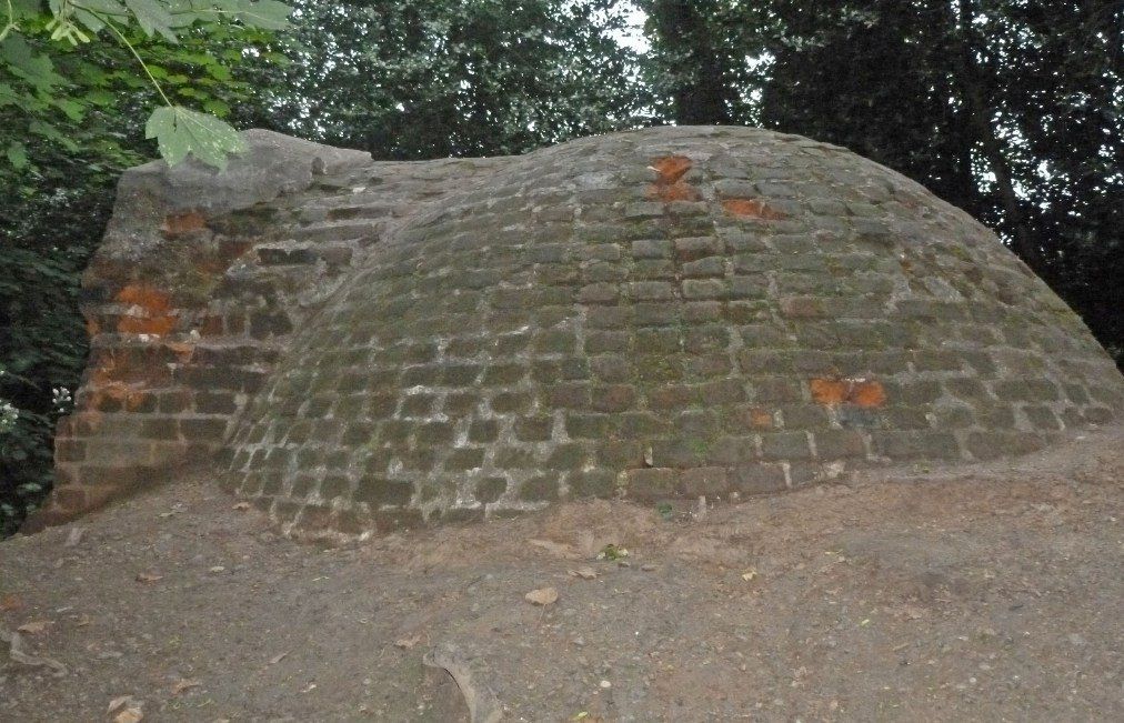Little remains to show the former glories of the estate but tucked away in the woods on the east side of the park is the ice house, the top of which can be seen. It dates from the earlier estate, probably having been built in the 18th or early 19th century. It is built in brick and has a domed top with the entrance just visible on the left. Internally it is likely to have a domed bottom terminating in a drain.