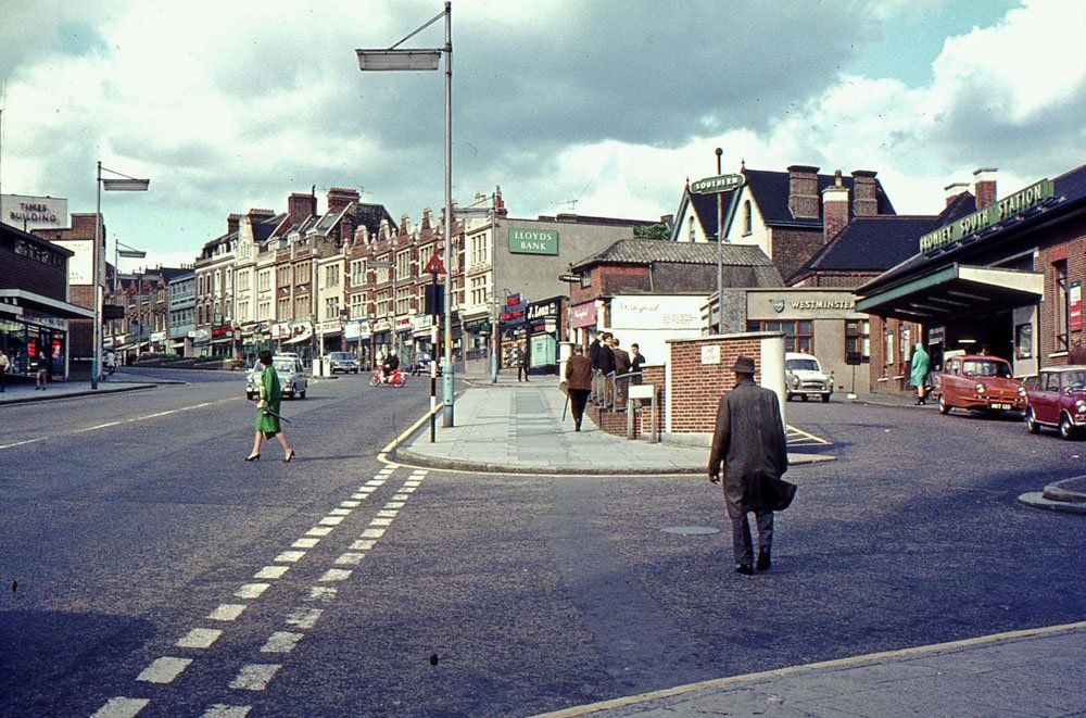 The most obvious change, apart from to fashion, is to the forecourt in front of the station which itself is largely unaltered apart from the clutter of vehicles and a fruit stall in front of it. The green Southern "sausage" sign has been replaced by the BR sign, it too an historical feature now ! One subtle change is to the row of shops with Dutch gables in the middle background which have been removed by 2010.