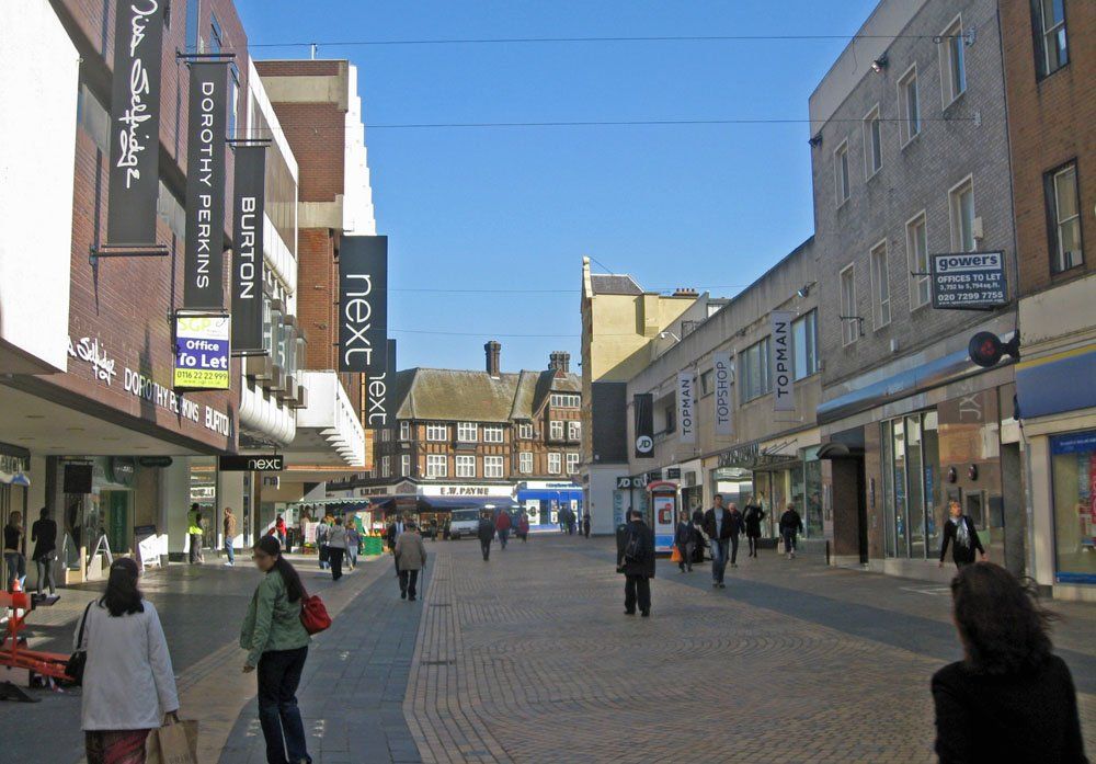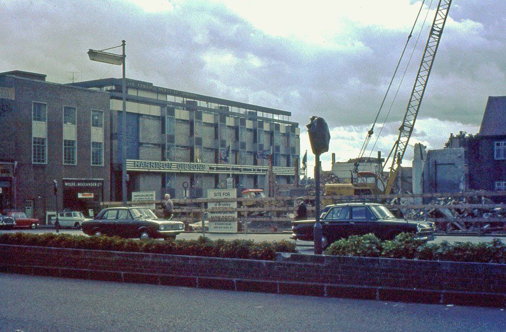 After Harrison Gibson's store burnt down in 1968, the site was being cleared for replacement. The Ringers Road extension, reached by a footbridge, was still present and remained as part of the Army & Navy store which took over the site, to be replaced by TKMaxx which no longer required it. The Wolf and Hollander building on the left remains, although now a Laura Ashley outlet. Sadly, the central flower beds have been removed. Ringers Road itself has become part of a one-way system around the back of town and the empty space has been filled with flats.