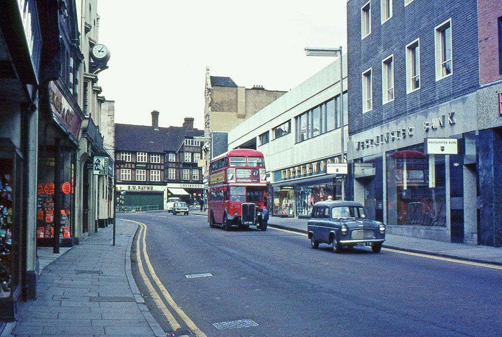 Orientation is quite easy here, despite the pedestrianisation, as the NatWest bank is still in the same building and Payne's the jewellers continues to occupy its large Market Square shop. The 47 bus is on its way to Farnborough, today it terminates at Catford bus garage. On the left can just be seen the entrance to Woolworths before it moved to its final location in the Broadway.