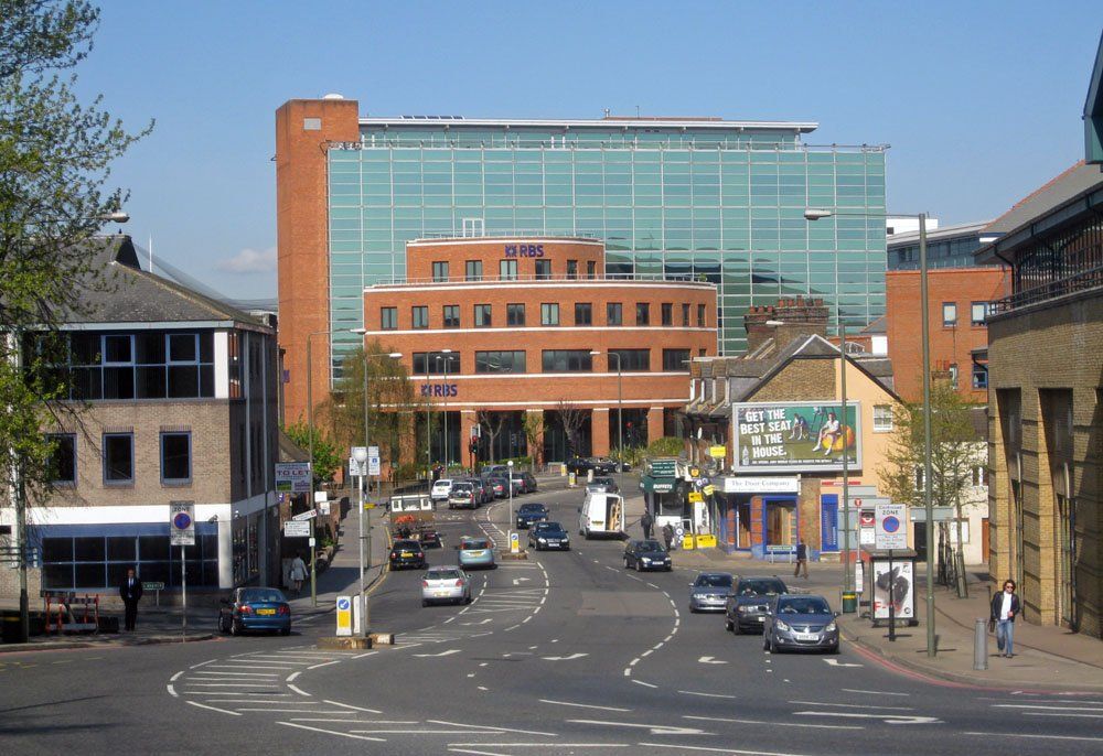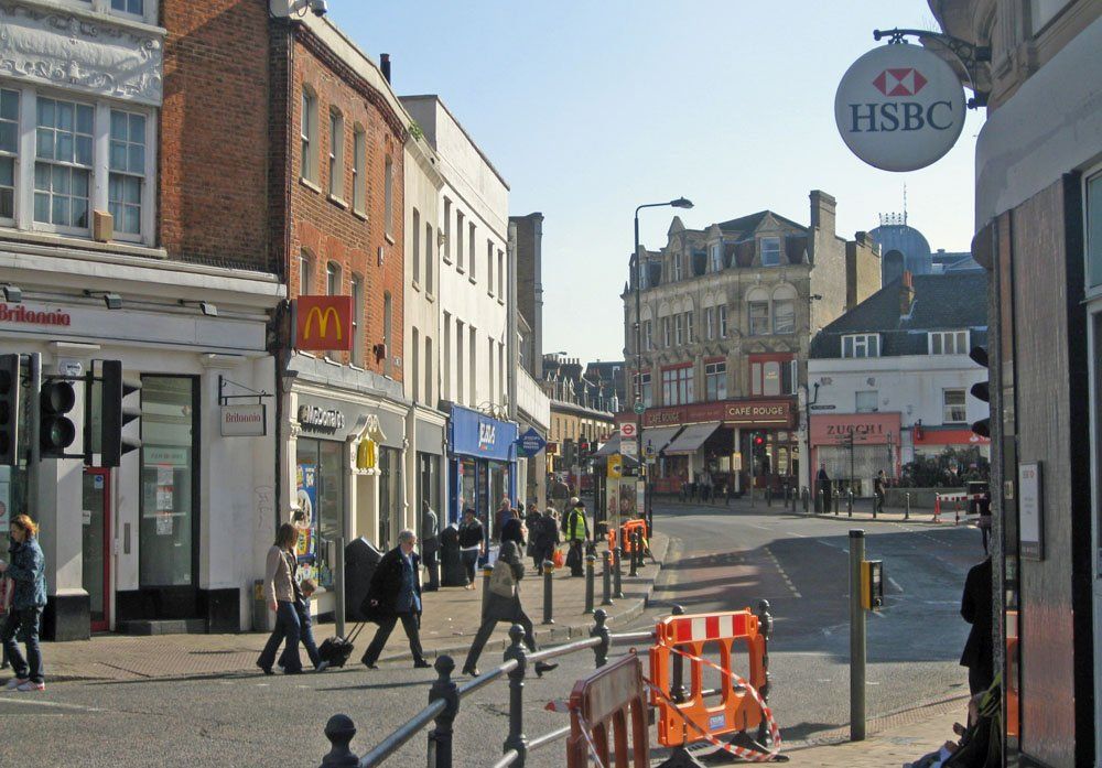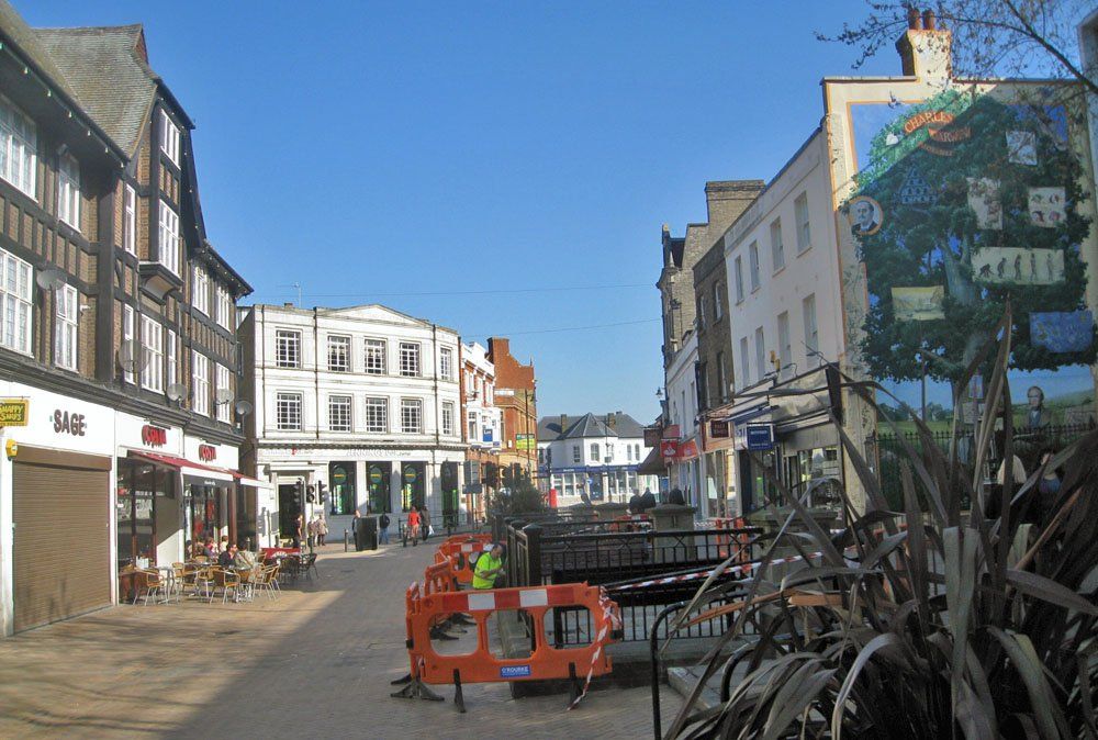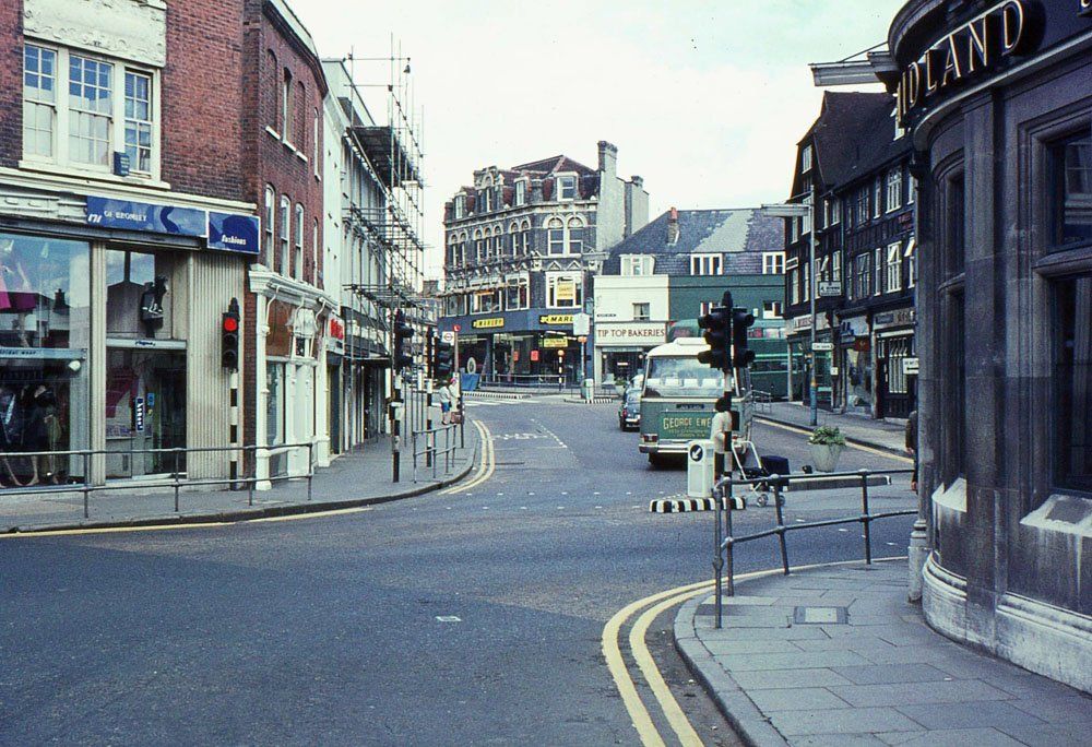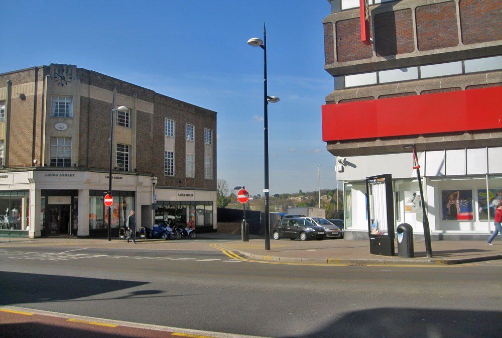The northern side of the Market Square shows little alteration although the top of the Glades can just be seen in 2010 peeking out below the HSBC sign. The main structural change is the closure of the road round which a double deck green bus is disappearing and the fact, perhaps not very obvious, that traffic from Church Road behind the camera must now turn left only. The bank on the right has had some cosmetic improvements.