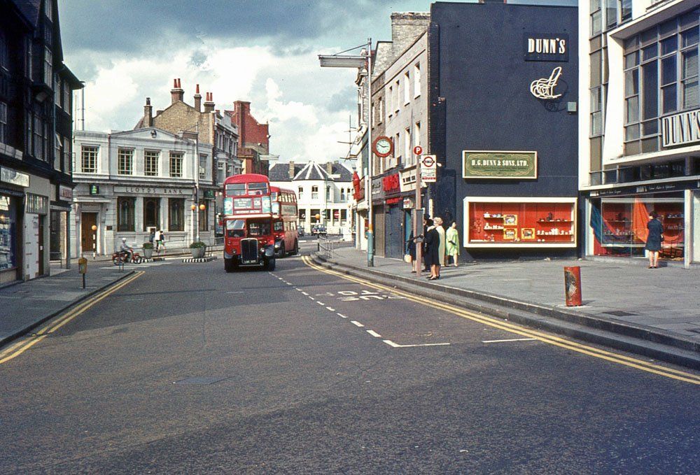 A 126 on its way to Beckenham Junction leads through an almost deserted Market Square, ignoring the 47 bus stop. Today, with no vehicles, it has become rather cluttered, making it difficult to match the camera viewpoint, but the rather plain wall next to Dunns furniture store (also rebuilt following a fire) has now been utilised for the Darwin mural. On the left the buildings remain the same and, at first glance, so does the white Lloyds Bank building in the distance, albeit now a betting shop. However, closer examination shows it has acquired an extra floor at some point between the two photographs.