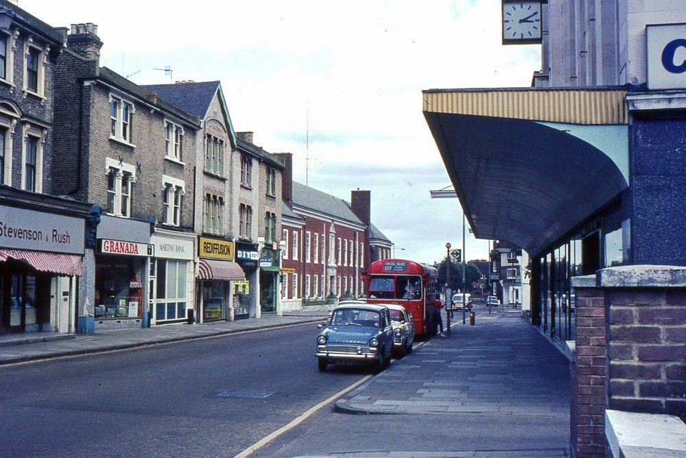 The Town Hall remains much as before, although not much used by the Council, but nearly everything else has changed in Tweedy Road. In 1968, it was still a quiet street leading down to the roundabout with Widmore Road, fronted by mock Tudor shops next to the unmade Love Lane. Today, it is the A21 and leads directly to Kentish Way which itself was built over Love Lane and the shops. Old houses on both sides of the 1968 picture, in later years mainly used by professional and charitable organisations, have also completely disappeared and new offices have been built to the left with a grassy area beside the fire station on the right.