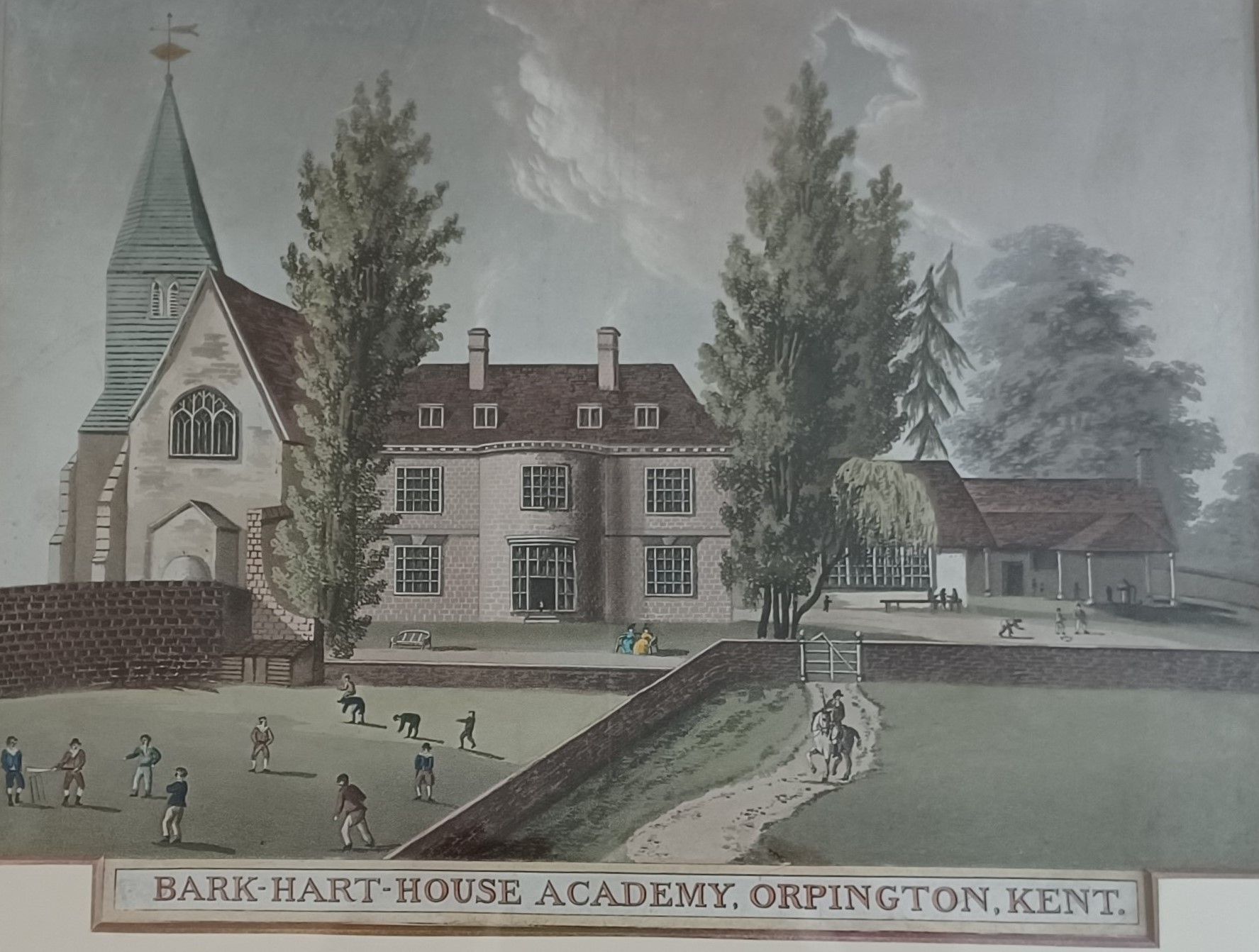 A painting from the 1770-80s of the Bark Hart Academy which existed for around 50 years. It was housed in Bark Hart house, which dated to Tudor times, and adjoined the old church. It is one of the earliest pictures of boys playing cricket