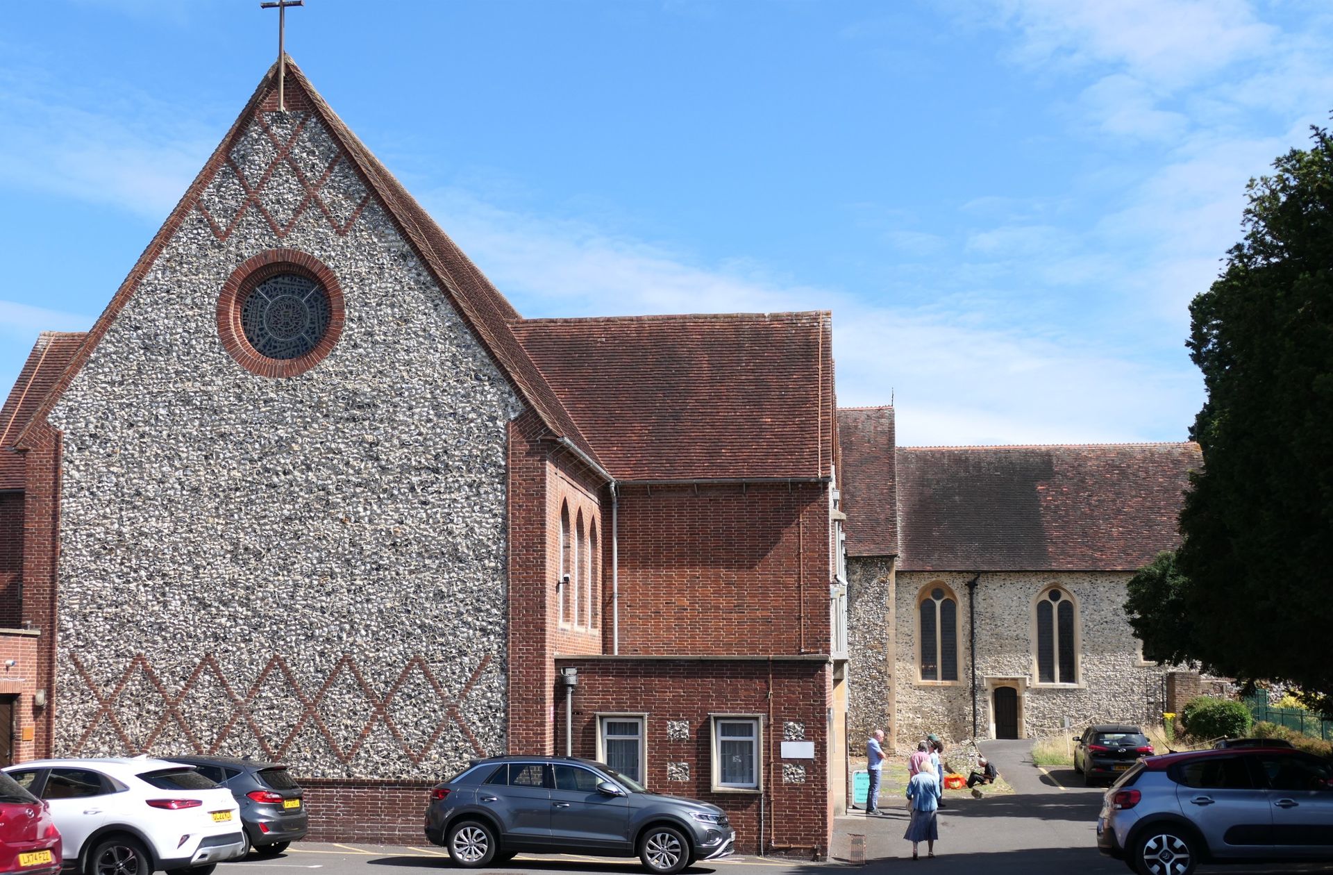A view from the south showing the 1950s church on the left and the earlier, 16th century building on the right.