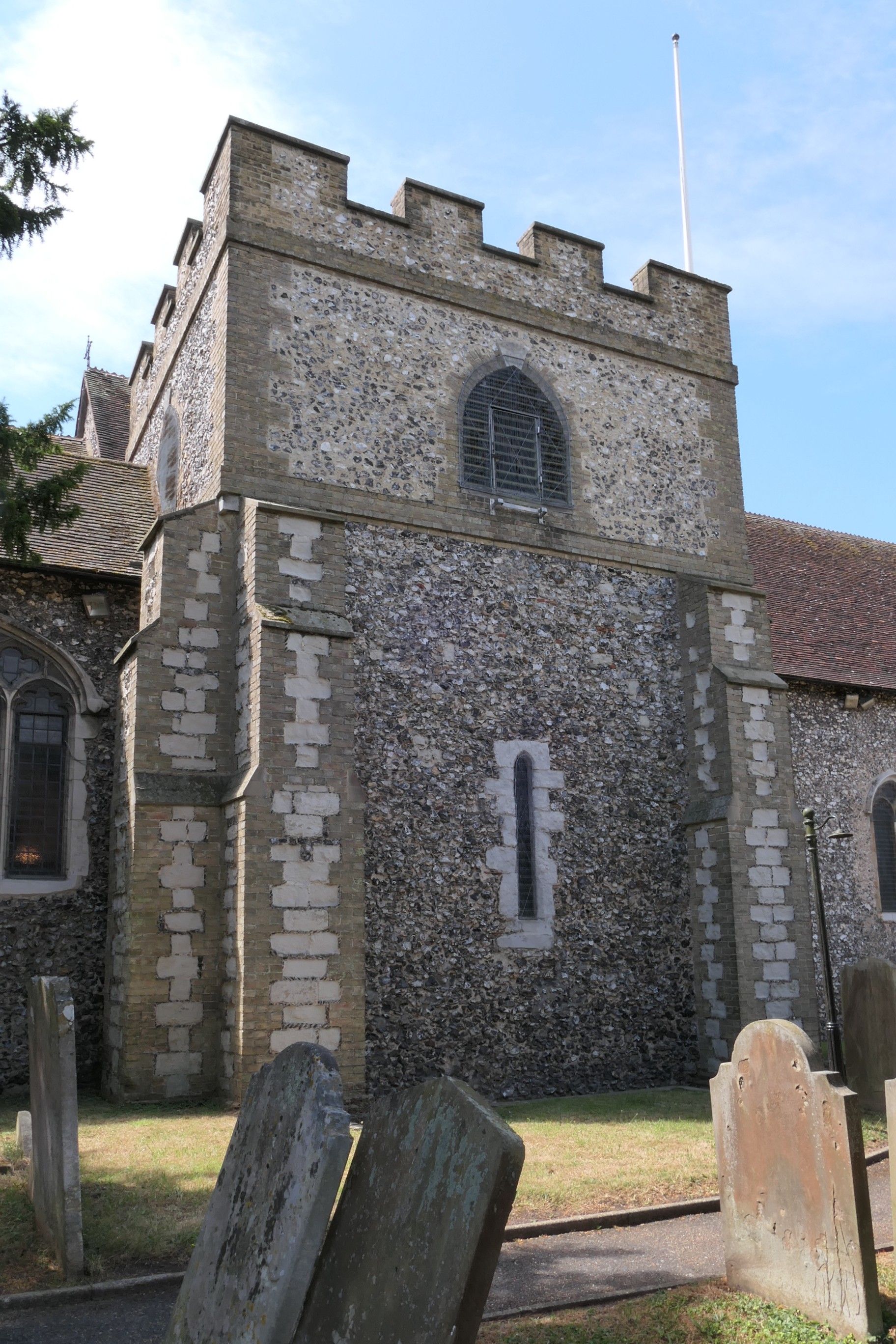 We started with a tour of the unusual church which has the original east-west nave at right angles to the newer south-north building. Lesley Birse, the church archivist, was able to point out many of the features of the church which in part dates back to Saxon times. Then we ventured out into the heat where Christine Hellicar outlined the history of Bark Hart house which had once stood next to the original building, after which we walked round the graveyard which holds a number of memorable graves, and then crossed the road to the very large extension in which are to be found the WW1 graves. Michael Marriott kindly explained why the graves were there and provided some details of the short lives of those commemorated.