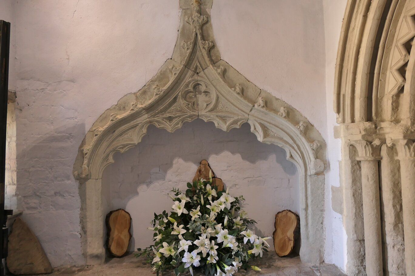The C14th tomb of rector Nicholas de Ystele in the old church porch was decorated with flowers.