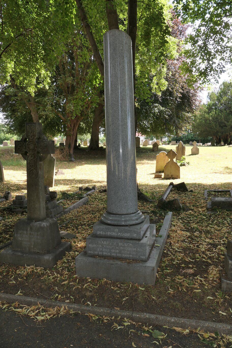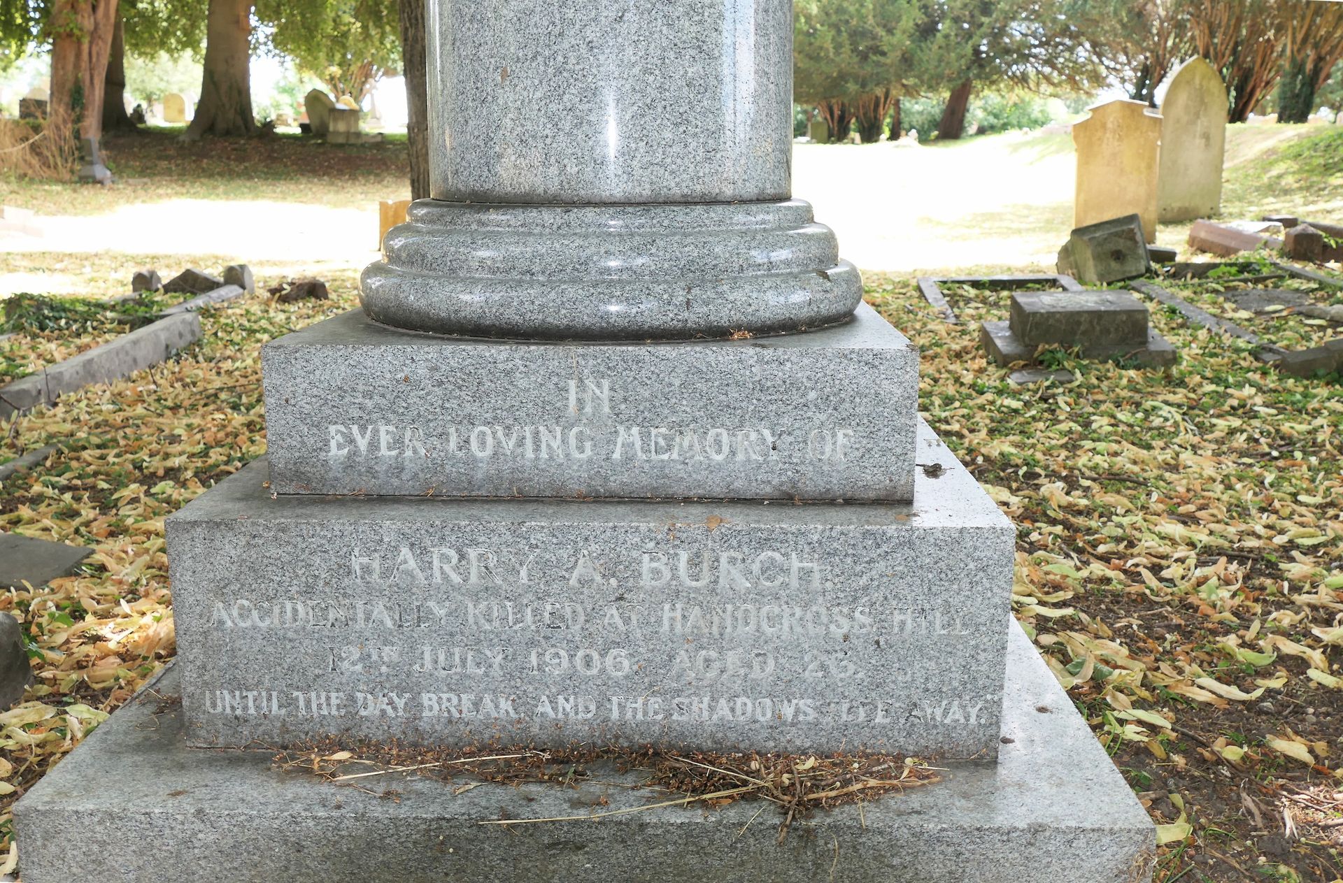 Among the many ornate graves of the famous (in their time) and not so famous, is this unusual monument to Harry Burch, killed in a dreadful road accident in July 1906 on Handcross Hill in Sussex.