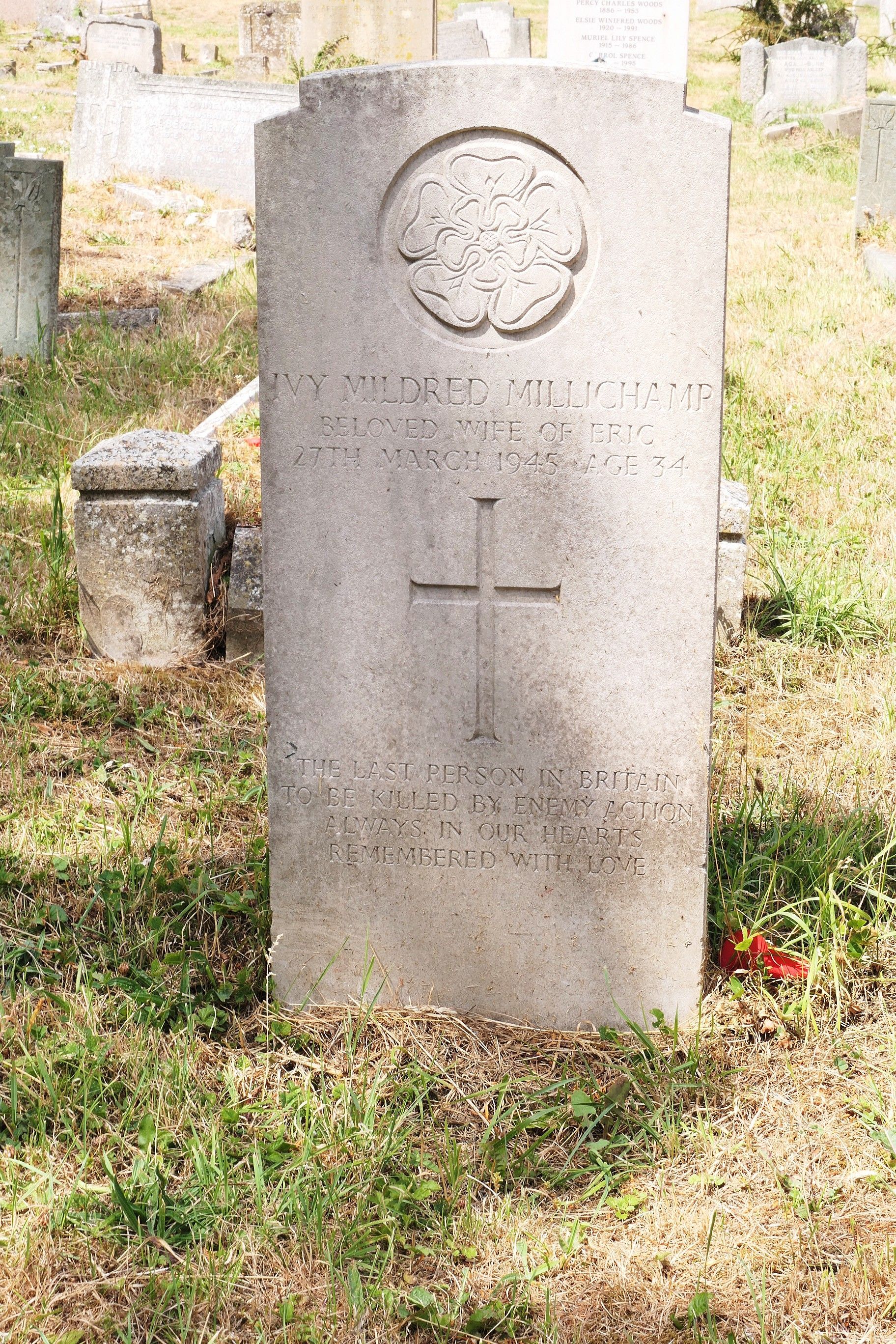 The gravestone of the unfortunate Ivy Millichamp, considered to be the last civilian killed in WW2 by the final V2 rocket attack on 27th March 1945. She was the only fatal casualty. More details of the attack can be found in our March 2011 magazine.
