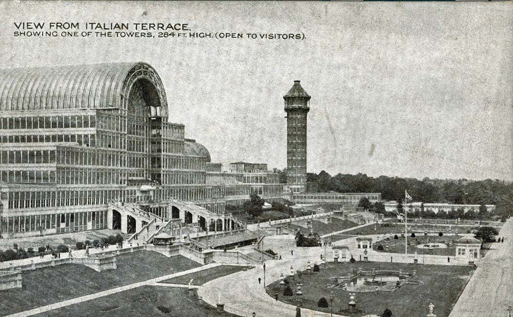 The Crystal Palace with the water towers on either side to power the many fountains.