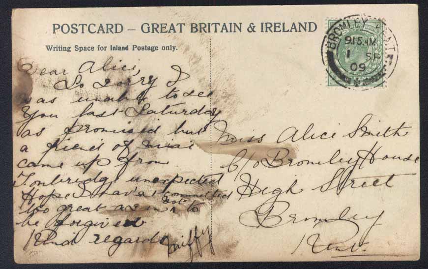 Dear Alice So sorry I was unable to see you last Saturday as promised but a friend of mine came up from Tonbridge unexpected Hope I haven’t committed too great a sin not to be forgiven. ? regards Smiffy