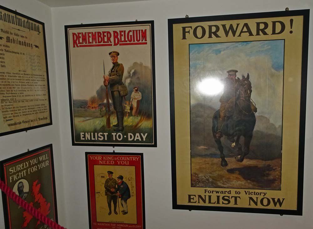 Unlike the French and German conscript armies, the British regular army was quite small and its rapid increase in size at the start of the War had to be achieved by encouraging enlistment by volunteers. A selection of posters shows how men were encouraged to take up arms for their country. Other less attractive methods included women placing a white feather on those they considered to cowardly to join up.