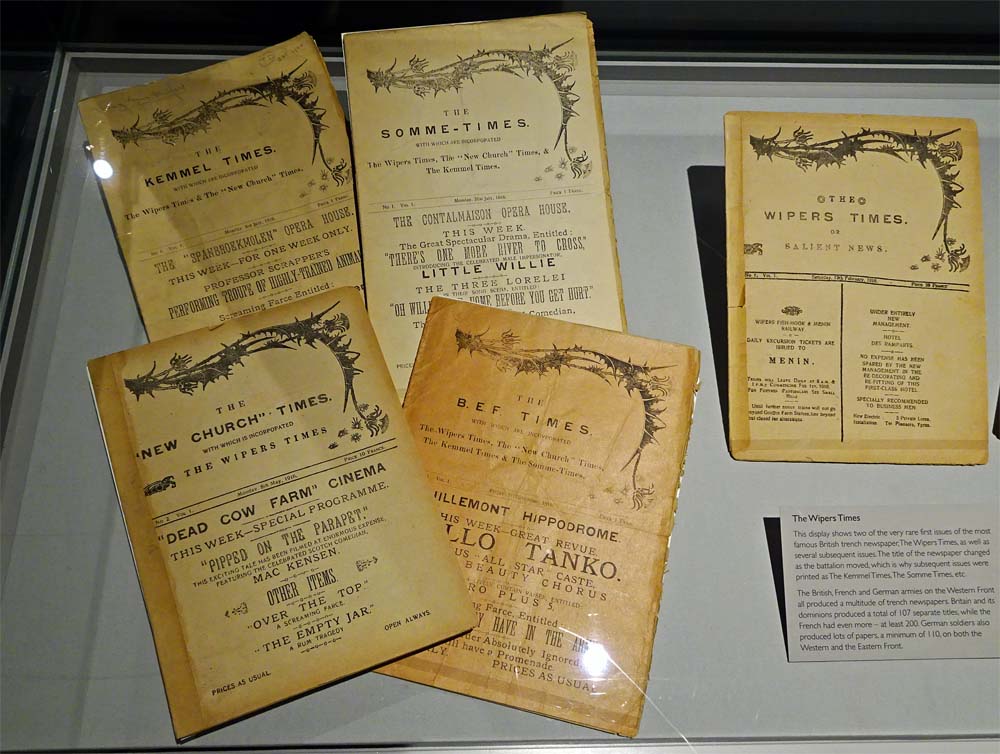 One of the bloodiest battles of the war, in 1916, was the 3rd Battle of Ypres, known as Passchendaele. The town of Ypres was virtually destroyed in the War but it became known for the publication from 1916 of the Wipers Times, using the mispronunciation common at the time for the local town. Some rare examples are included in the exhibition, their front covers pretending to be advertisements usually paro-dying some current war-time action.