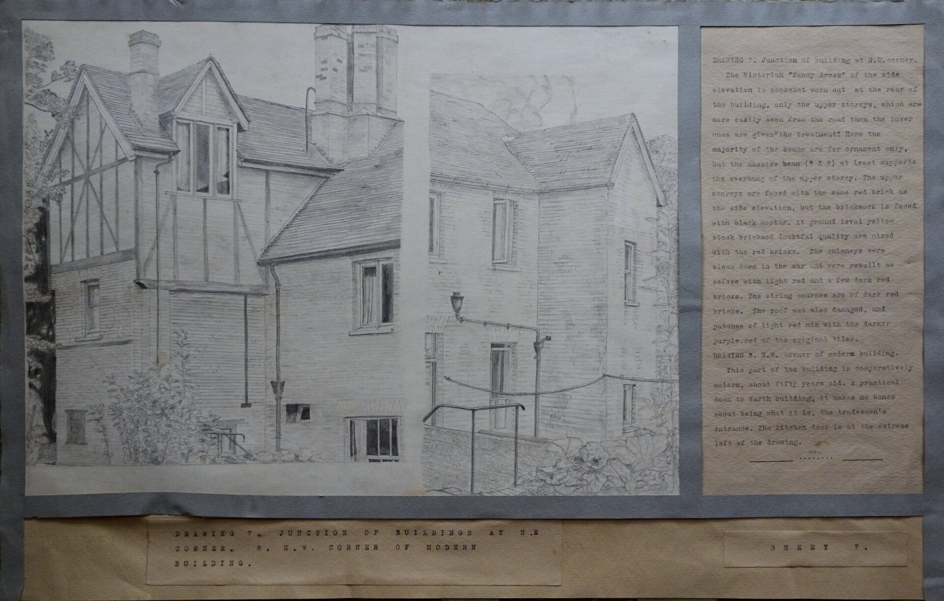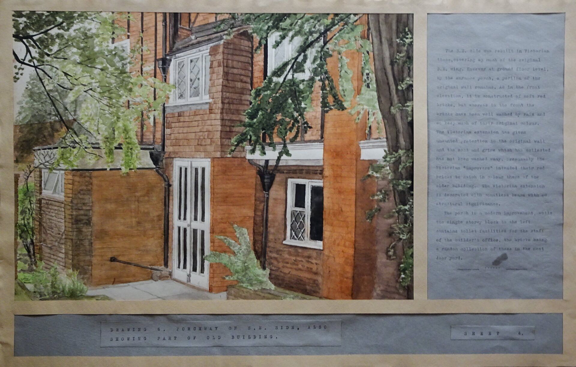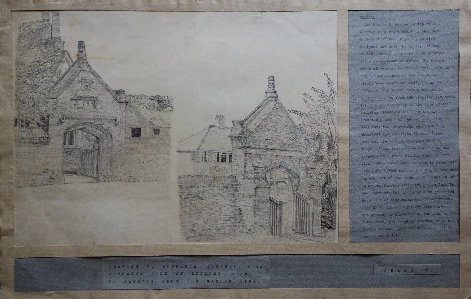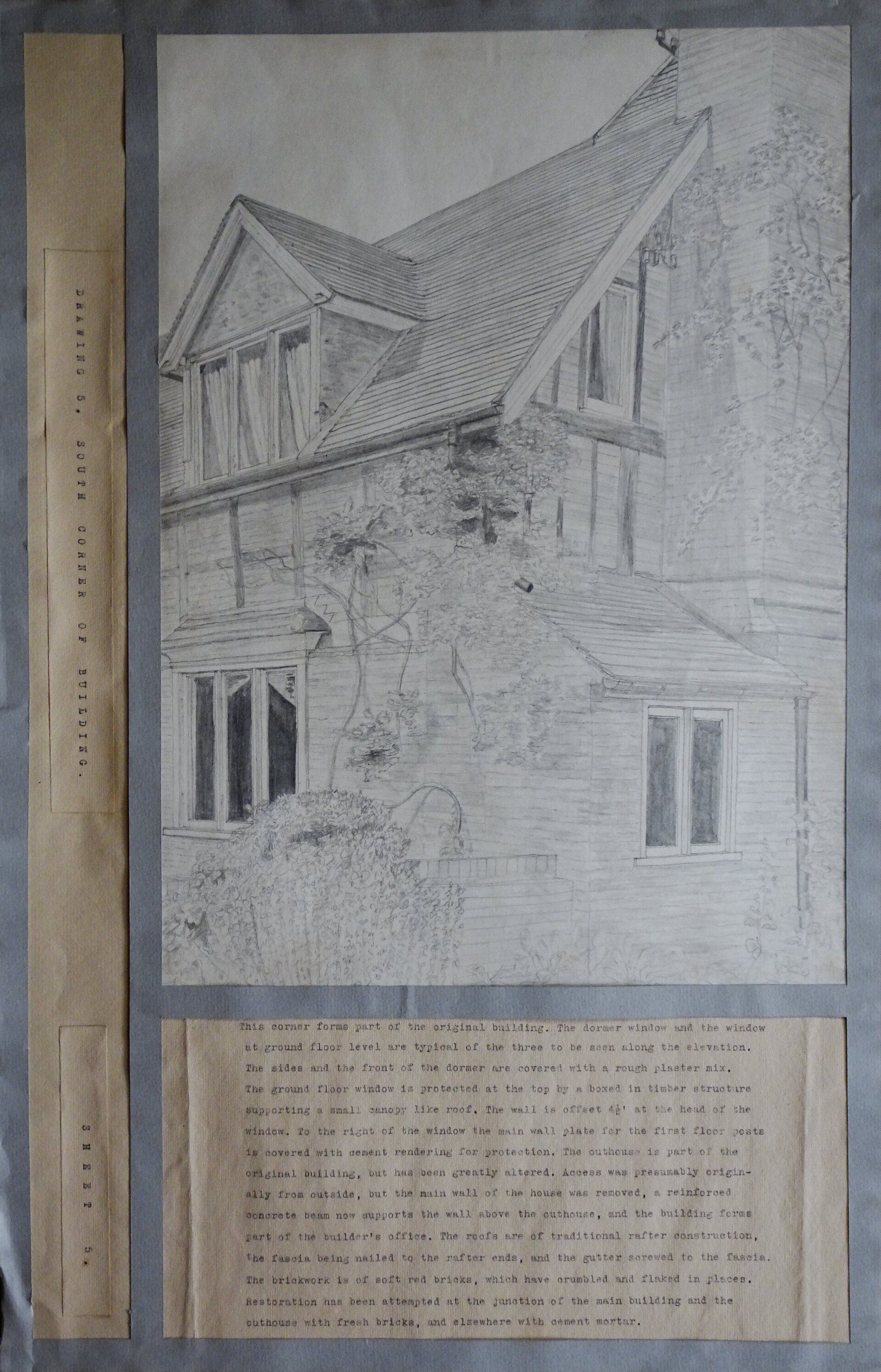 In 2012 a Bristol book seller, Gerald Baker, purchased a collection of books and artefacts from a deceased's estate and, amongst much else he found the drawings below showing very detailed views and plans of the property, probably around 1960. The material was not examined for some years but when Mr. Baker realised the location of the subject matter, he kindly donated the drawings to the Society. They are now in the Local Archives.