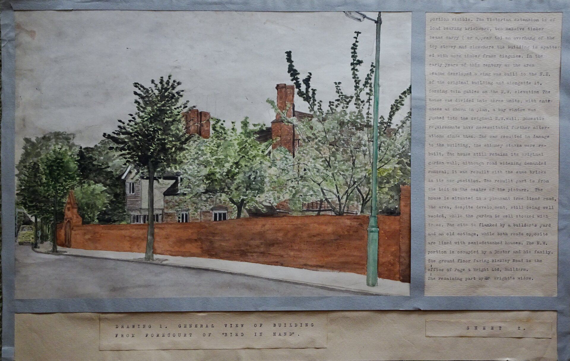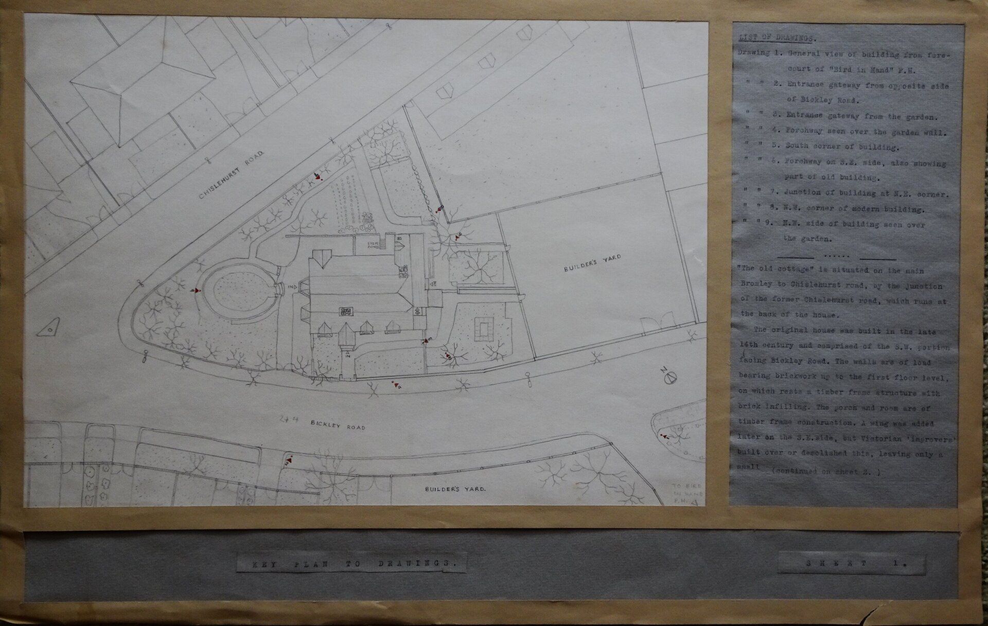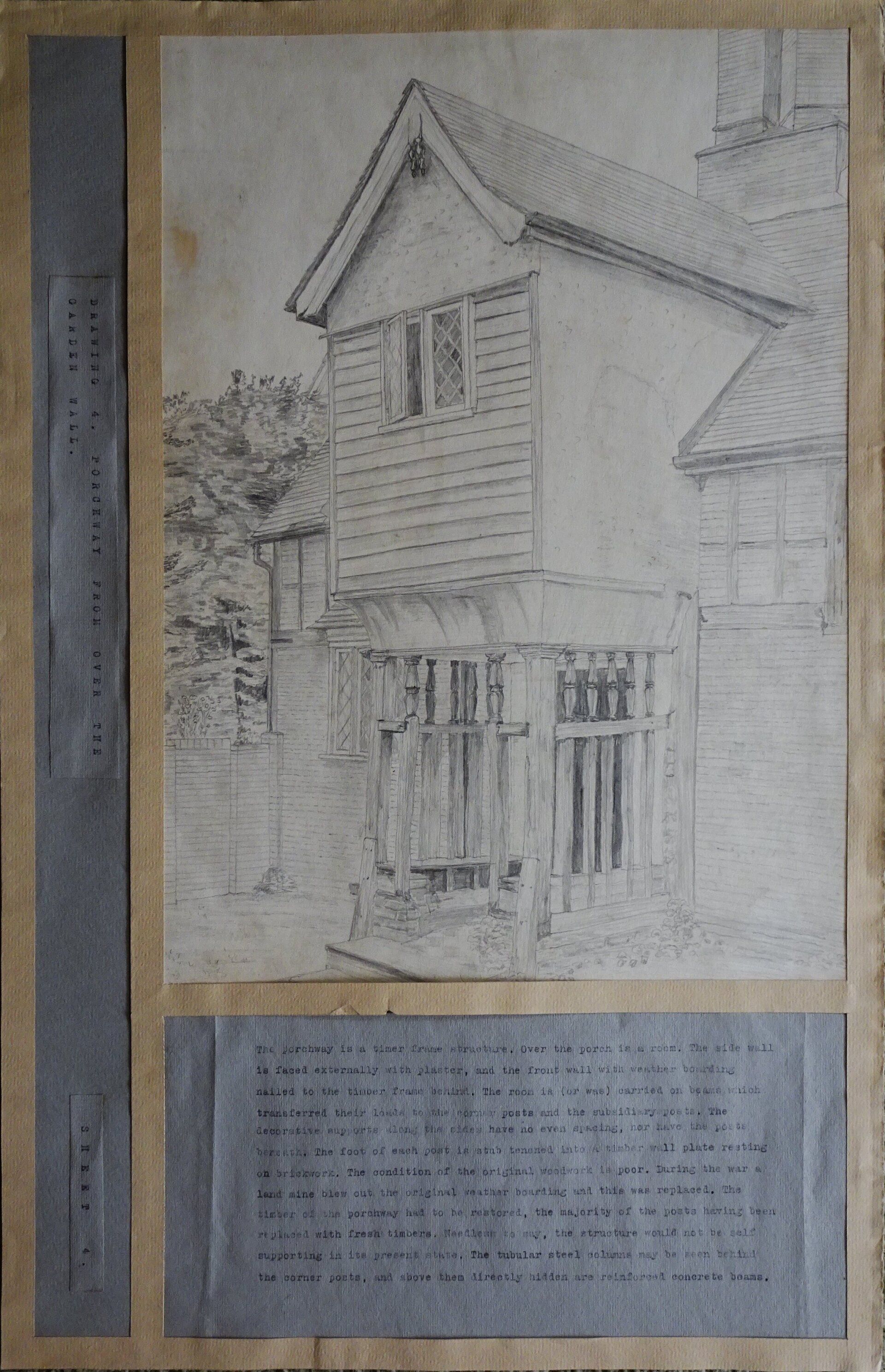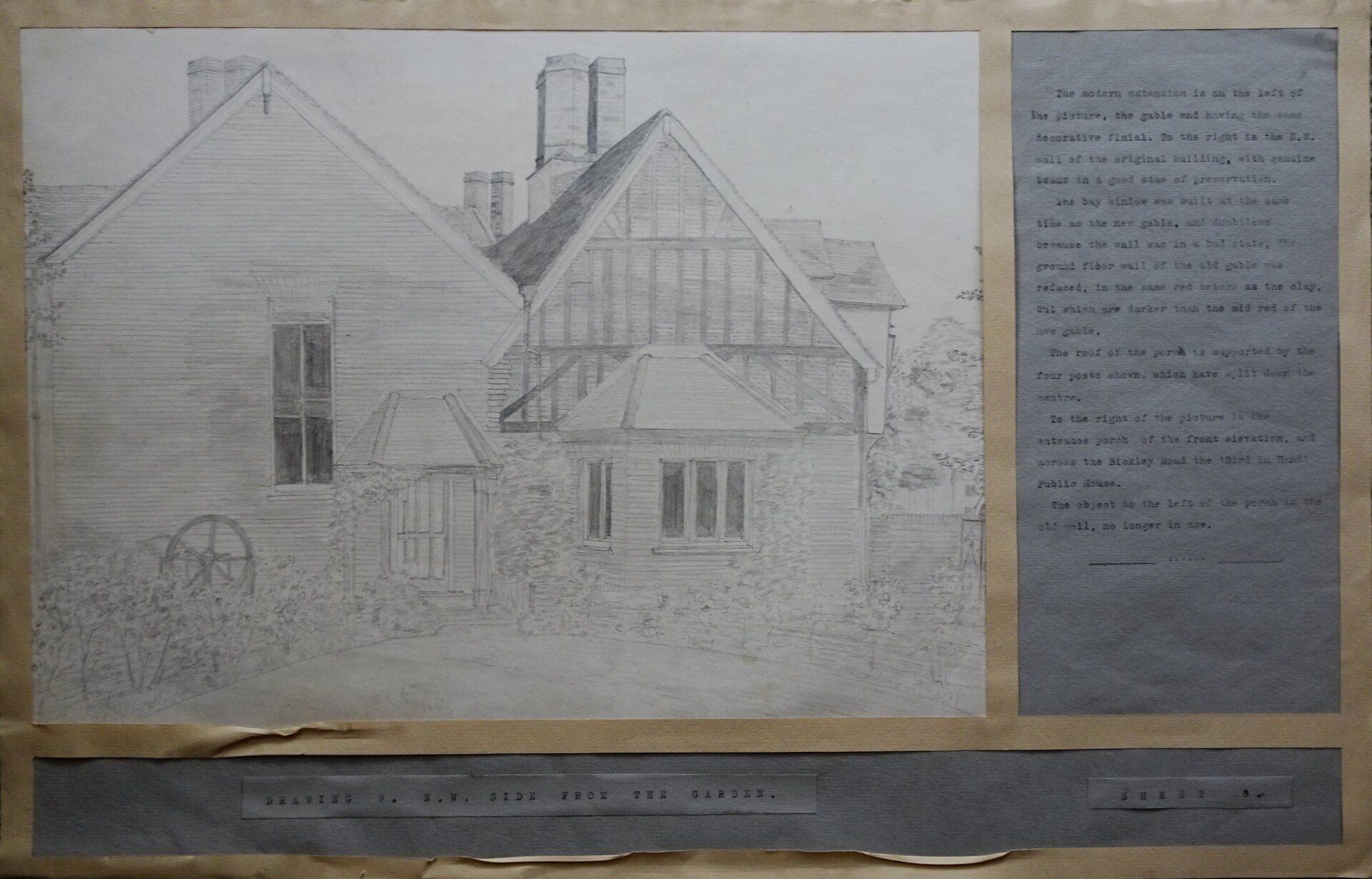 In 2012 a Bristol book seller, Gerald Baker, purchased a collection of books and artefacts from a deceased's estate and, amongst much else he found the drawings below showing very detailed views and plans of the property, probably around 1960. The material was not examined for some years but when Mr. Baker realised the location of the subject matter, he kindly donated the drawings to the Society. They are now in the Local Archives.